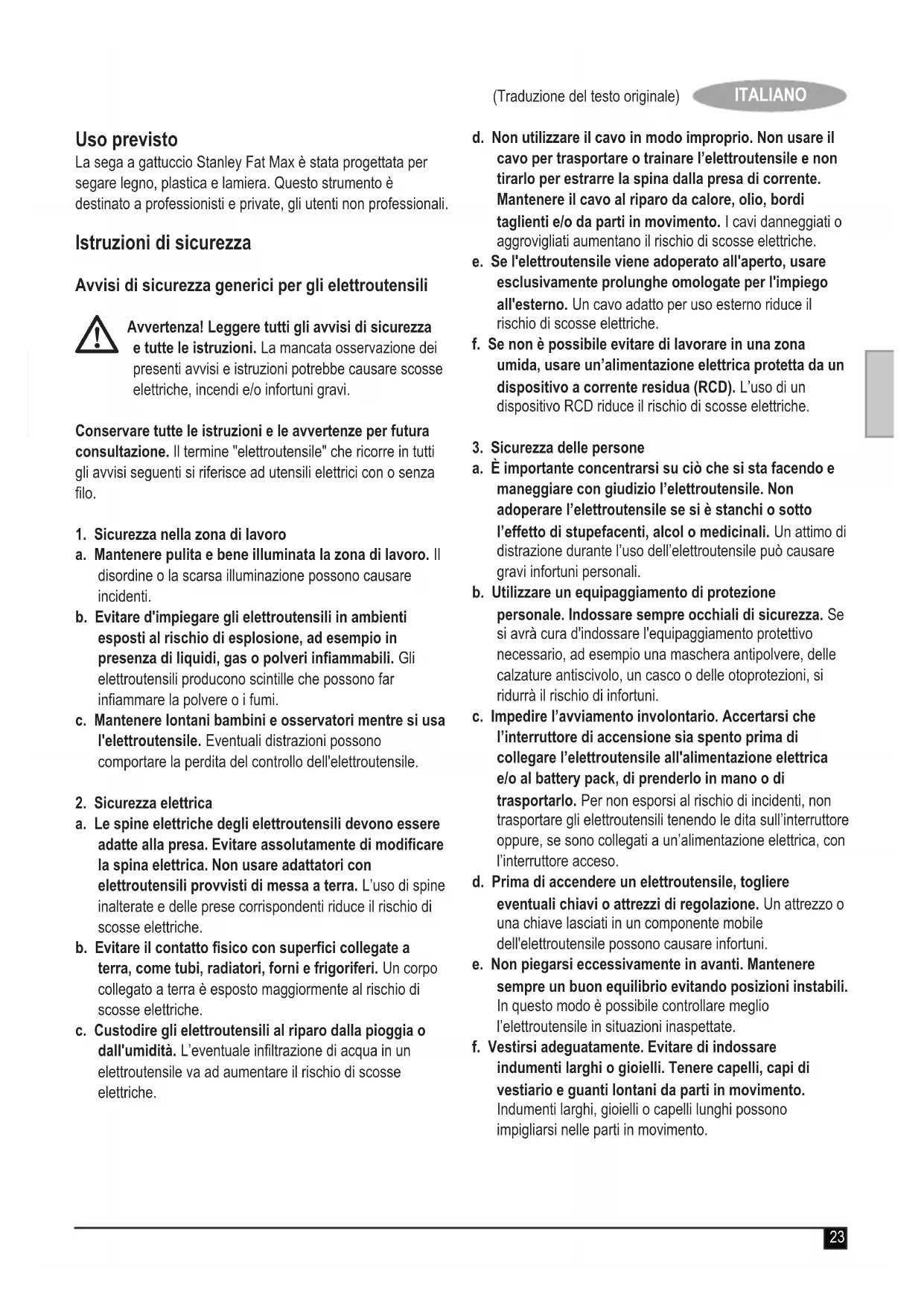 In caso di danneggiamento del filo di alimentazione, è necessario farlo riparare dal fabbricante o presso un centro assistenza Stanley Fat Max autorizzato in modo da evitare eventuali pericoli.
