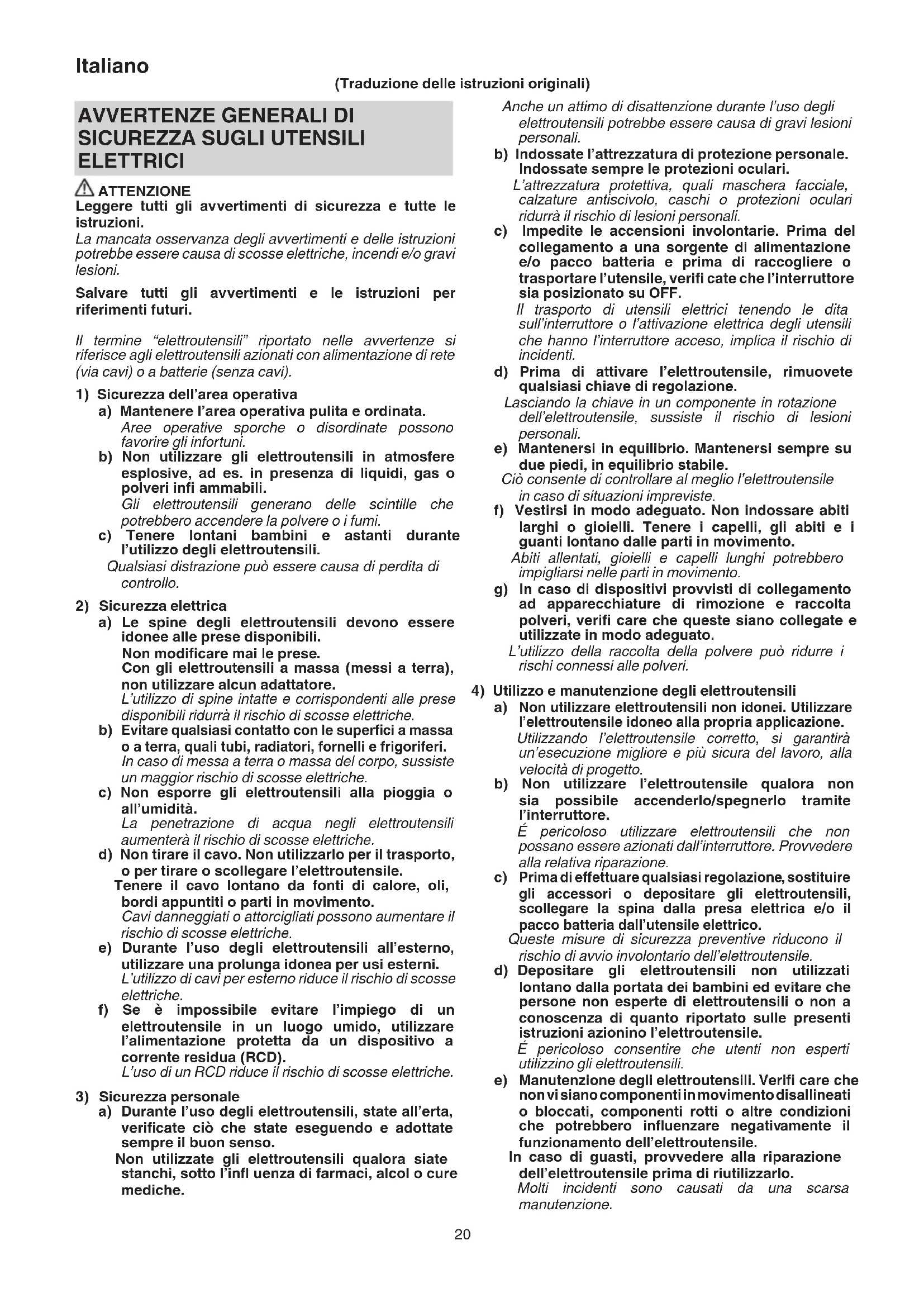 ELETTRICI ATTENZIONE Leggere tutti gli avvertimenti di sicurezza e tutte le istruzioni. La mancata osservanza degli avvertimenti e delle istruzioni potrebbe essere causa di scosse elettriche, incendi e/o gravi lesioni. Salvare tutti gli avvertimenti e le istruzioni per riferimenti futuri. Il termine “elettroutensili” riportato nelle avvertenze si riferisce agli elettroutensili azionati con alimentazione di rete (via cavi) o a batterie (senza cavi).
