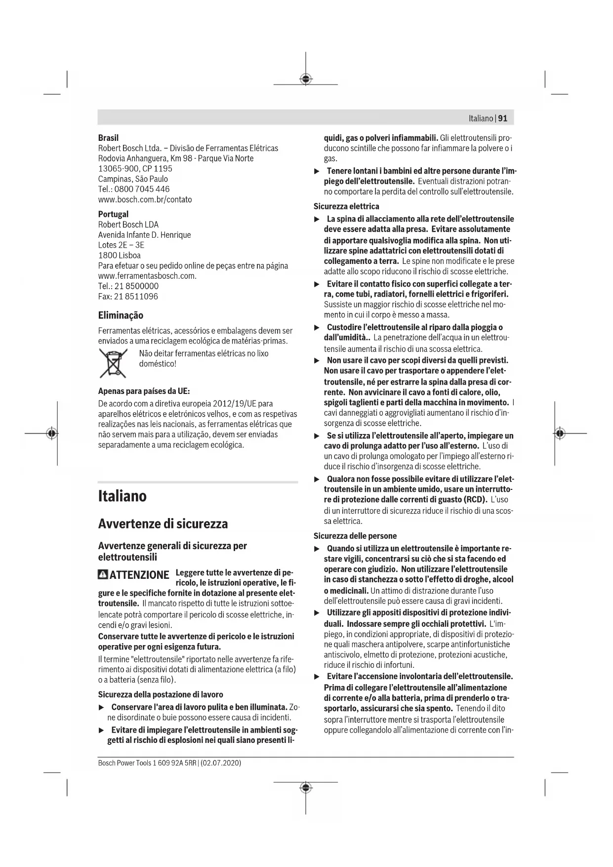 Serviço pós-venda e aconselhamento O serviço pós-venda responde às suas perguntas a respeito de serviços de reparação e de manutenção do seu produto, assim como das peças sobressalentes. Desenhos explodidos e informações acerca das peças sobressalentes também em: www.bosch-pt.com A nossa equipa de consultores Bosch esclarece com prazer todas as suas dúvidas a respeito dos nossos produtos e acessórios. Indique para todas as questões e encomendas de peças sobressalentes a referência de 10 dígitos de acordo com a placa de caraterísticas do produto. 1 609 92A 5RR | (02.07.2020) Bosch Power ToolsItaliano | 91 Brasil Robert Bosch Ltda. – Divisão de Ferramentas Elétricas Rodovia Anhanguera, Km 98 - Parque Via Norte 13065-900, CP 1195 Campinas, São Paulo Tel.: 0800 7045 446 www.bosch.com.br/contato Portugal Robert Bosch LDA Avenida Infante D. Henrique Lotes 2E – 3E 1800 Lisboa Para efetuar o seu pedido online de peças entre na página www.ferramentasbosch.com. Tel.: 21 8500000 Fax: 21 8511096 Eliminação Ferramentas elétricas, acessórios e embalagens devem ser enviados a uma reciclagem ecológica de matérias-primas. Não deitar ferramentas elétricas no lixo doméstico! Apenas para países da UE: De acordo com a diretiva europeia 2012/19/UE para aparelhos elétricos e eletrónicos velhos, e com as respetivas realizações nas leis nacionais, as ferramentas elétricas que não servem mais para a utilização, devem ser enviadas separadamente a uma reciclagem ecológica. Italiano Avvertenze di sicurezza Avvertenze generali di sicurezza per elettroutensili ATTENZIONE Leggere tutte le avvertenze di pe- ricolo, le istruzioni operative, le fi- gure e le specifiche fornite in dotazione al presente elet- troutensile. Il mancato rispetto di tutte le istruzioni sottoe- lencate potrà comportare il pericolo di scosse elettriche, in- cendi e/o gravi lesioni. Conservare tutte le avvertenze di pericolo e le istruzioni operative per ogni esigenza futura. Il termine "elettroutensile" riportato nelle avvertenze fa rife- rimento ai dispositivi dotati di alimentazione elettrica (a filo) o a batteria (senza filo). Sicurezza della postazione di lavoro u Conservare l'area di lavoro pulita e ben illuminata. Zo- ne disordinate o buie possono essere causa di incidenti. u Evitare di impiegare l’elettroutensile in ambienti sog- getti al rischio di esplosioni nei quali siano presenti li- quidi, gas o polveri infiammabili. Gli elettroutensili pro- ducono scintille che possono far infiammare la polvere o i gas. u Tenere lontani i bambini ed altre persone durante l’im- piego dell’elettroutensile. Eventuali distrazioni potran- no comportare la perdita del controllo sull’elettroutensile. Sicurezza elettrica u La spina di allacciamento alla rete dell’elettroutensile deve essere adatta alla presa. Evitare assolutamente di apportare qualsivoglia modifica alla spina. Non uti- lizzare spine adattatrici con elettroutensili dotati di collegamento a terra. Le spine non modificate e le prese adatte allo scopo riducono il rischio di scosse elettriche. u Evitare il contatto fisico con superfici collegate a ter- ra, come tubi, radiatori, fornelli elettrici e frigoriferi. Sussiste un maggior rischio di scosse elettriche nel mo- mento in cui il corpo è messo a massa. u Custodire l’elettroutensile al riparo dalla pioggia o dall’umidità.. La penetrazione dell’acqua in un elettrou- tensile aumenta il rischio di una scossa elettrica. u Non usare il cavo per scopi diversi da quelli previsti. Non usare il cavo per trasportare o appendere l’elet- troutensile, né per estrarre la spina dalla presa di cor- rente. Non avvicinare il cavo a fonti di calore, olio, spigoli taglienti e parti della macchina in movimento. I cavi danneggiati o aggrovigliati aumentano il rischio d’in- sorgenza di scosse elettriche. u Se si utilizza l’elettroutensile all’aperto, impiegare un cavo di prolunga adatto per l’uso all’esterno. L’uso di un cavo di prolunga omologato per l’impiego all’esterno ri- duce il rischio d’insorgenza di scosse elettriche. u Qualora non fosse possibile evitare di utilizzare l’elet- troutensile in un ambiente umido, usare un interrutto- re di protezione dalle correnti di guasto (RCD). L’uso di un interruttore di sicurezza riduce il rischio di una scos- sa elettrica. Sicurezza delle persone u Quando si utilizza un elettroutensile è importante re- stare vigili, concentrarsi su ciò che si sta facendo ed operare con giudizio. Non utilizzare l’elettroutensile in caso di stanchezza o sotto l’effetto di droghe, alcool o medicinali. Un attimo di distrazione durante l’uso dell’elettroutensile può essere causa di gravi incidenti. u Utilizzare gli appositi dispositivi di protezione indivi- duali. Indossare sempre gli occhiali protettivi. L'im- piego, in condizioni appropriate, di dispositivi di protezio- ne quali maschera antipolvere, scarpe antinfortunistiche antiscivolo, elmetto di protezione, protezioni acustiche, riduce il rischio di infortuni. u Evitare l’accensione involontaria dell’elettroutensile. Prima di collegare l’elettroutensile all’alimentazione di corrente e/o alla batteria, prima di prenderlo o tra- sportarlo, assicurarsi che sia spento. Tenendo il dito sopra l’interruttore mentre si trasporta l’elettroutensile oppure collegandolo all’alimentazione di corrente con l’in- Bosch Power Tools 1 609 92A 5RR | (02.07.2020)92 | Italiano terruttore inserito, si vengono a creare situazioni perico- lose in cui possono verificarsi seri incidenti. u Prima di accendere l’elettroutensile togliere qualsiasi attrezzo di regolazione o chiave utilizzata. Un accesso- rio oppure una chiave che si trovi in una parte rotante del- la macchina può provocare seri incidenti. u Evitare di assumere posture anomale. Mantenere ap- poggio ed equilibrio adeguati in ogni situazione. In questo modo è possibile controllare meglio l’elettrouten- sile in caso di situazion