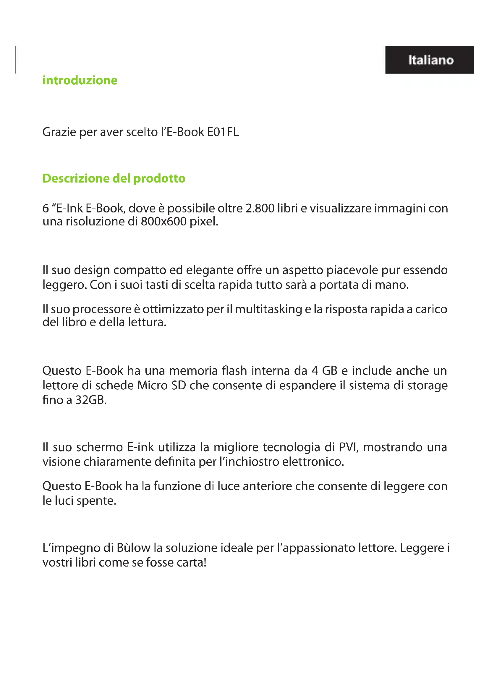 A főmenüben válassza a Felhasználói kézikönyv, és nyomja meg az Entert. Az eBook felhasználói kézikönyv megnyílik Műszaki támogatás További információk erről a termékről, kérjük, látogasson el a támogatási részt honlapunkon www.billowtechnology.com, vagy küldjön e-mailt a Support@billowtechnology.comintroduzione Grazie per aver scelto l’E-Book E01FL Descrizione del prodotto 6 “E-Ink E-Book, dove è possibile oltre 2.800 libri e visualizzare immagini con una risoluzione di 800x600 pixel. Il suo design compatto ed elegante ore un aspetto piacevole pur essendo leggero. Con i suoi tasti di scelta rapida tutto sarà a portata di mano. Il suo processore è ottimizzato per il multitasking e la risposta rapida a carico del libro e della lettura. Questo E-Book ha una memoria ash interna da 4 GB e include anche un lettore di schede Micro SD che consente di espandere il sistema di storage no a 32GB. Il suo schermo E-ink utilizza la migliore tecnologia di PVI, mostrando una visione chiaramente denita per l’inchiostro elettronico. Questo E-Book ha la funzione di luce anteriore che consente di leggere con le luci spente. L’impegno di Bùlow la soluzione ideale per l’appassionato lettore. Leggere i vostri libri come se fosse carta!contenuto della confezione -E01FL -Guida rapida di installazione Cavo Usb-Mini Nota: Vericare che la confezione contenga gli elementi sopra descritti. Se trovate tutti gli articoli mancanti o danneggiati, contattare il rivenditore. Requisiti di sistema -1 Porta USB 2.0 -Sistema Operativo Windows Descrizione delle parti