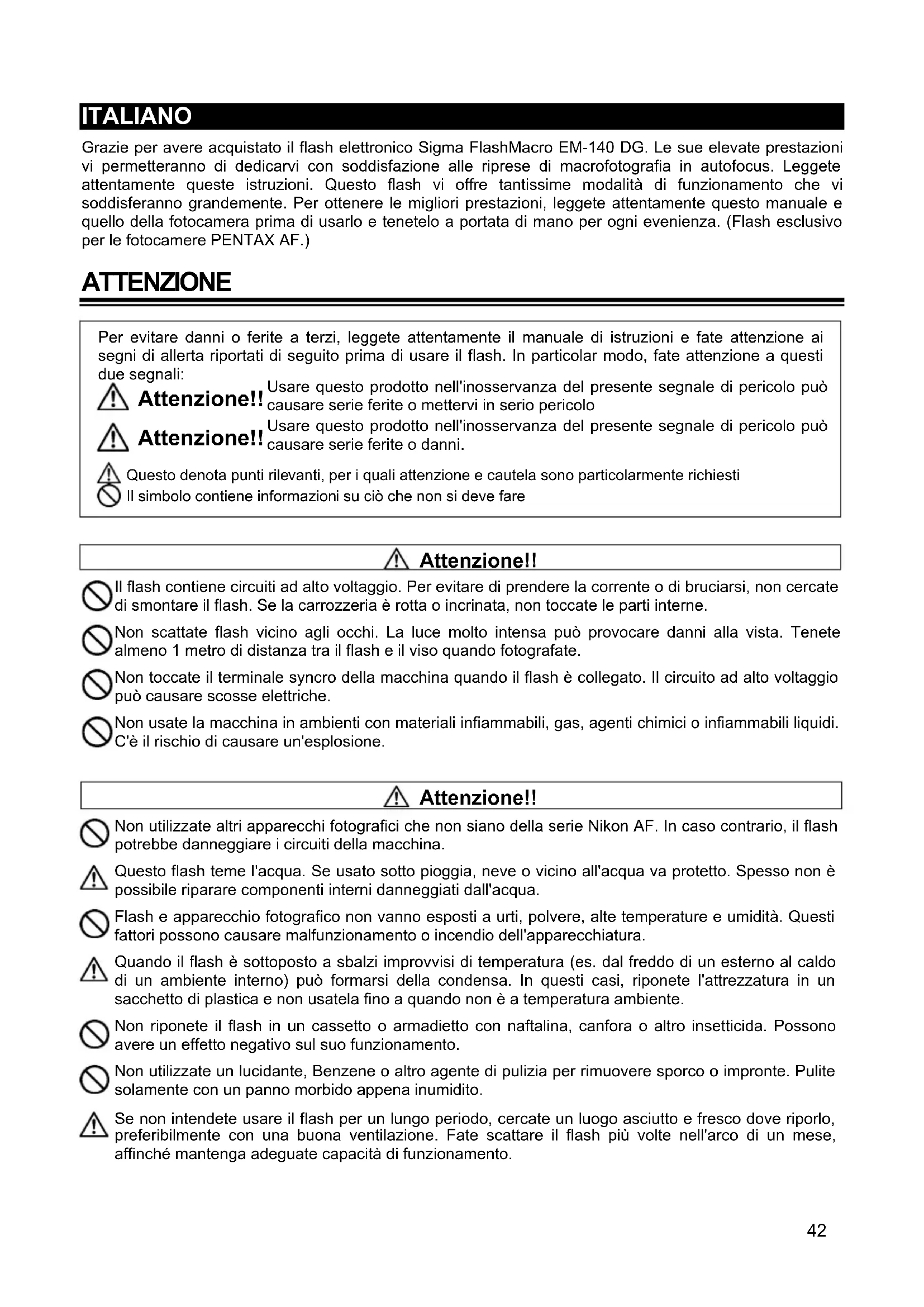 acerca de 3.0 seg. ( con pilas Ni-Cd o Niquel-hidrógeno) AUTODESCONECTABLE: disponible PESO: 430 g. DIMENSIONES (Unidad de Control): 76.7mm x 136.2mm x 82.4mm DIMENSIONES (Unidad de Flash): 126.6mm x 128.8mm x 30.5mm42 ITALIANO Grazie per avere acquistato il flash elettronico Sigma FlashMacro EM-140 DG. Le sue elevate prestazioni vi permetteranno di dedicarvi con soddisfazione alle riprese di macrofotografia in autofocus. Leggete attentamente queste istruzioni. Questo flash vi offre tantissime modalità di funzionamento che vi soddisferanno grandemente. Per ottenere le migliori prestazioni, leggete attentamente questo manuale e quello della fotocamera prima di usarlo e tenetelo a portata di mano per ogni evenienza. (Flash esclusivo per le fotocamere PENTAX AF.) ATTENZIONE
