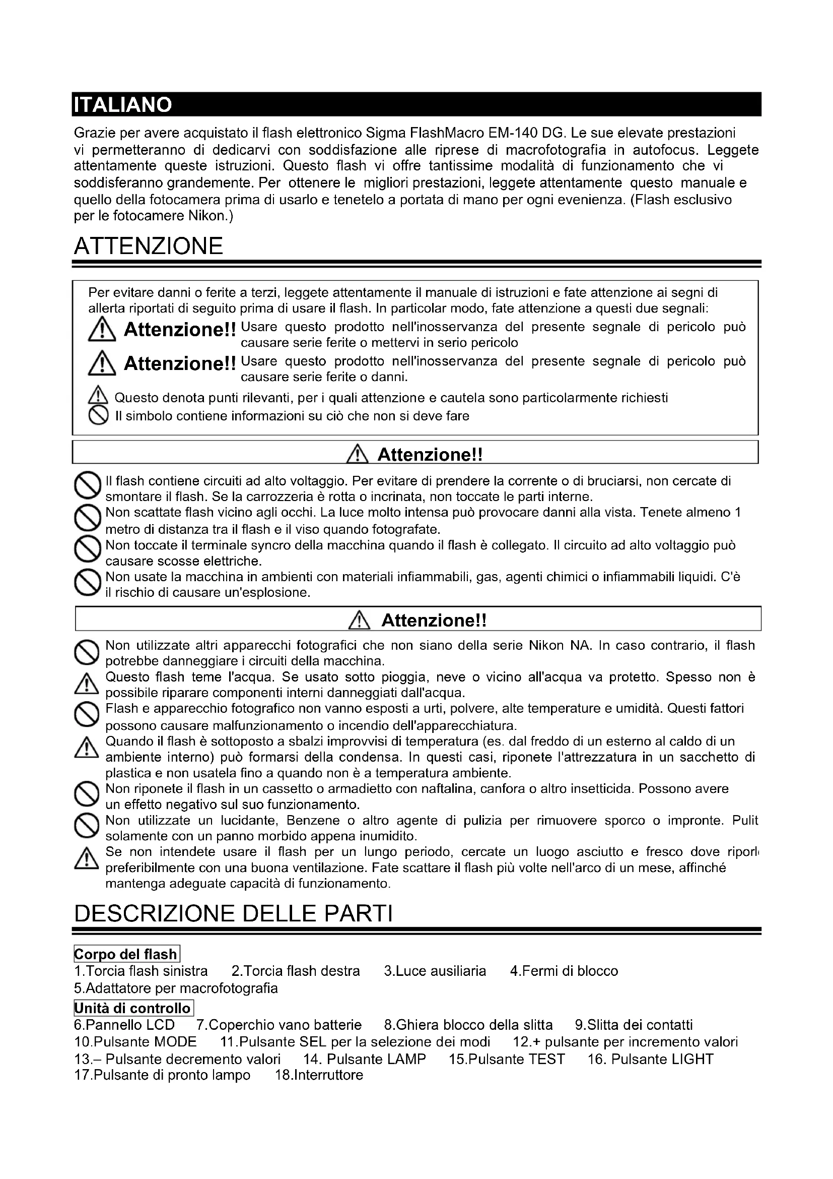 ITALIANO Grazie per avere acquistato il flash elettronico Sigma FlashMacro EM-140 DG. Le sue elevate prestazioni vi permetteranno di dedicarvi con soddisfazione alle riprese di macrofotografia in autofocus. Leggete attentamente queste istruzioni. Questo flash vi offre tantissime modalità di funzionamento che vi soddisferanno grandemente. Per ottenere le migliori prestazioni, leggete attentamente questo manuale e quello della fotocamera prima di usarlo e tenetelo a portata di mano per ogni evenienza. (Flash esclusivo per le fotocamere Nikon.) ATTENZIONE