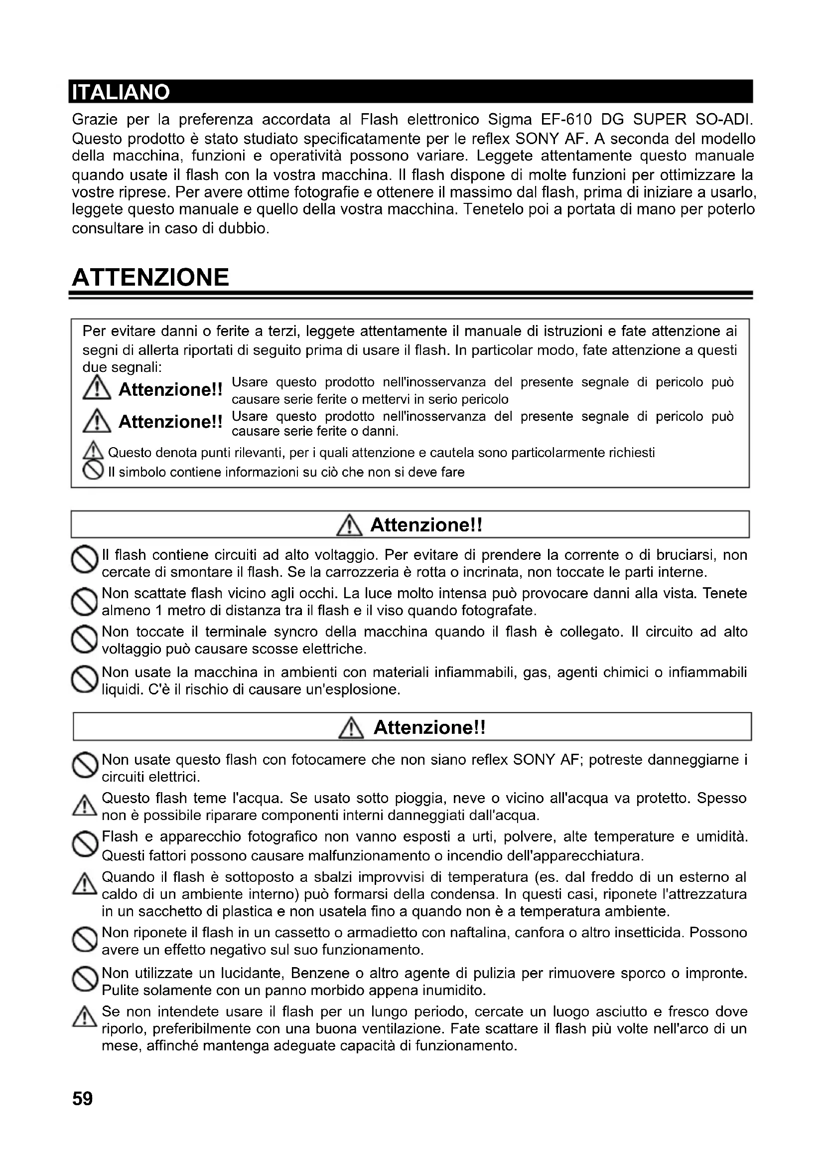 Attenzione!! Non usate questo flash con fotocamere che non siano reflex SONY AF; potreste danneggiarne icircuiti elettrici. Questo flash teme l'acqua. Se usato sotto pioggia, neve o vicino all'acqua va protetto. Spessonon è possibile riparare componenti interni danneggiati dall'acqua. Flash e apparecchio fotografico non vanno esposti a urti, polvere, alte temperature e umidità.Questi fattori possono causare malfunzionamento o incendio dell'apparecchiatura. Quando il flash è sottoposto a sbalzi improvvisi di temperatura (es. dal freddo di un esterno al caldo di un ambiente interno) può formarsi della condensa. In questi casi, riponete l'attrezzatura in un sacchetto di plastica e non usatela fino a quando non è a temperatura ambiente. Non riponete il flash in un cassetto o armadietto con naftalina, canfora o altro insetticida. Possono avere un effetto negativo sul suo funzionamento. Non utilizzate un lucidante, Benzene o altro agente di pulizia per rimuovere sporco o impronte.Pulite solamente con un panno morbido appena inumidito. Se non intendete usare il flash per un lungo periodo, cercate un luogo asciutto e fresco doveriporlo, preferibilmente con una buona ventilazione. Fate scattare il flash più volte nell'arco di unmese, affinché mantenga adeguate capacità di funzionamento.60