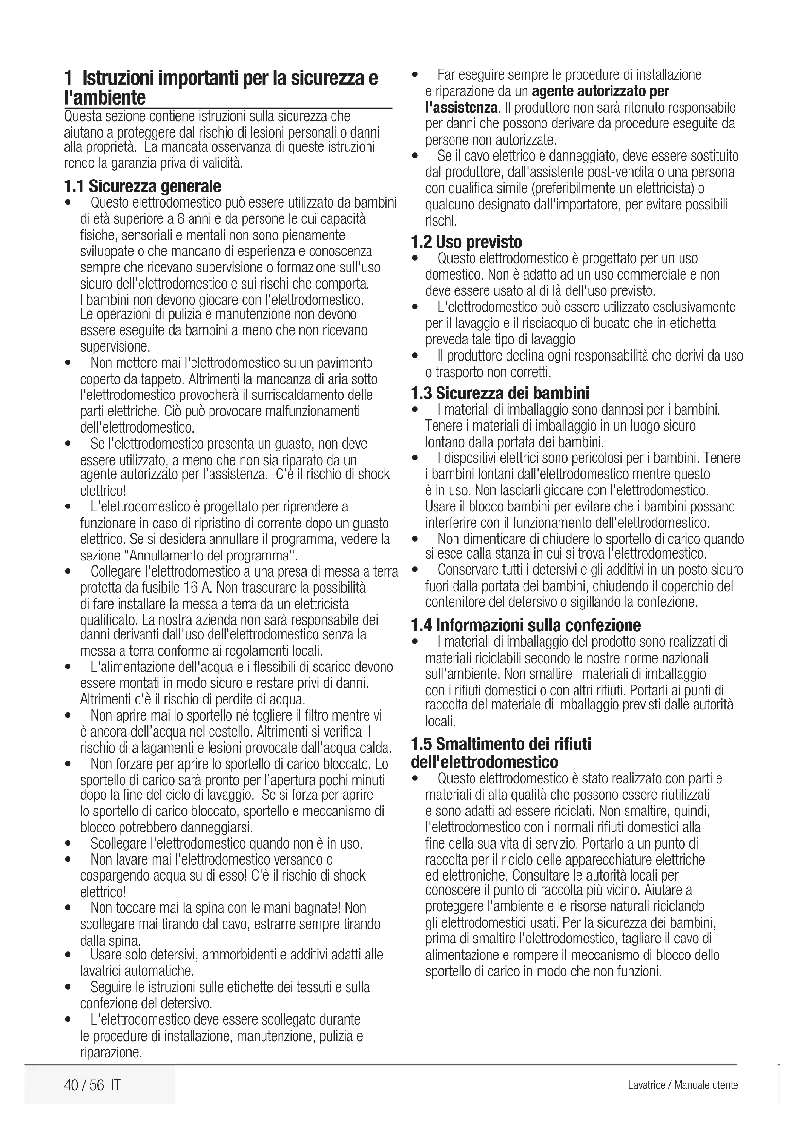 contactezvotrerevendeuroul'agentdeserviceagréé.N'essayezjamaisderéparerunappareilendommagéparvousmême.2820523302_IT/ 17-01-13.(18:24) Numero del documento40/56IT Lavatrice / Manuale utente 1 Istruzioni importanti per la sicurezza e l'ambiente Questasezionecontieneistruzionisullasicurezzache aiutano a proteggere dal rischio di lesioni personali o danni allaproprietà.Lamancataosservanzadiquesteistruzioni rendelagaranziaprivadivalidità.
