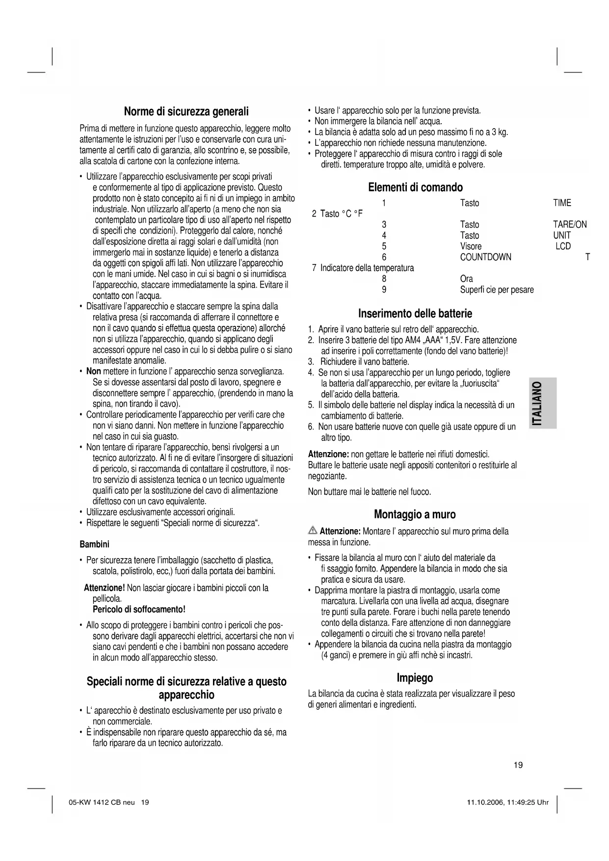 - Appendere la bilancia da cucina nella piastra da montaggio (4 ganci) e premere in giù affi nchè si incastri. Impiego La bilancia da cucina è stata realizzata per visualizzare il peso di generi alimentari e ingredienti. 05-KW 1412 CB neu 19 11.10.2006, 11:49:25 Uhr20 ITALIANO ITALIANO Impostazione dell‘ ora (12 h)