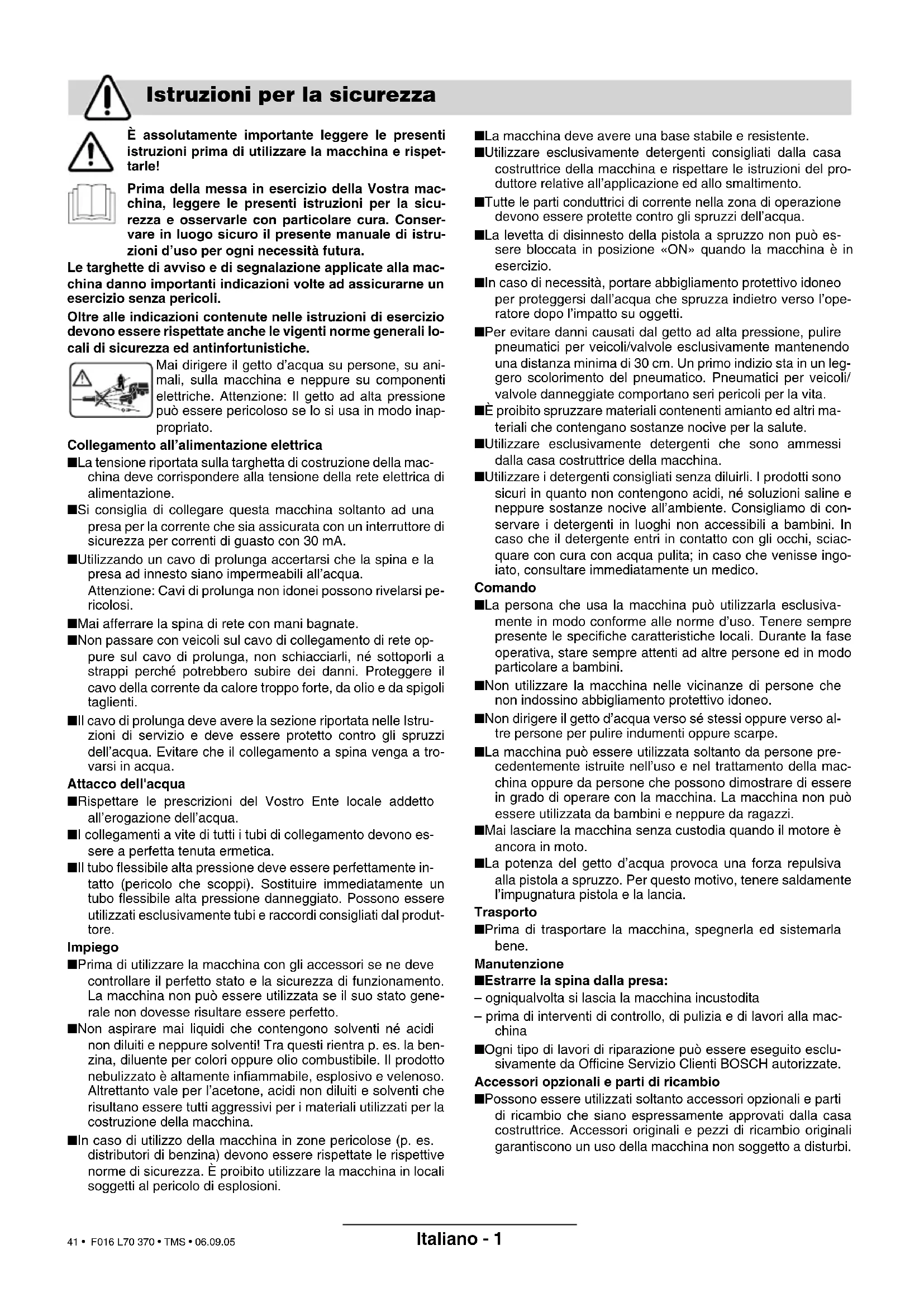 é inferior a 91 dB (A). Processo de avaliação da conformidade conforme anexo VIII. Leinfelden, 01.11.2004. Dr. Egbert Schneider Dr. Eckerhard Strötgen Senior Vice President Head of Product Engineering Certification Robert Bosch GmbH, Power Tools Division Reservado o direito a modificações Protecção do meio-ambiente Eliminação Serviço ao cliente Declaração de conformidade F016 L70 370.book Seite 7 Donnerstag, 29. September 2005 10:40 10 40 • F016 L70 370 • TMS • 06.09.05Italiano - 1 È assolutamente importante leggere le presenti istruzioni prima di utilizzare la macchina e rispet- tarle! Prima della messa in esercizio della Vostra mac- china, leggere le presenti istruzioni per la sicu- rezza e osservarle con particolare cura. Conser- vare in luogo sicuro il presente manuale di istru- zioni d’uso per ogni necessità futura. Le targhette di avviso e di segnalazione applicate alla mac- china danno importanti indicazioni volte ad assicurarne un esercizio senza pericoli. Oltre alle indicazioni contenute nelle istruzioni di esercizio devono essere rispettate anche le vigenti norme generali lo- cali di sicurezza ed antinfortunistiche. Mai dirigere il getto d’acqua su persone, su ani- mali, sulla macchina e neppure su componenti elettriche. Attenzione: Il getto ad alta pressione può essere pericoloso se lo si usa in modo inap- propriato. Collegamento all’alimentazione elettrica ■ La tensione riportata sulla targhetta di costruzione della mac- china deve corrispondere alla tensione della rete elettrica di alimentazione. ■ Si consiglia di collegare questa macchina soltanto ad una presa per la corrente che sia assicurata con un interruttore di sicurezza per correnti di guasto con 30 mA. ■ Utilizzando un cavo di prolunga accertarsi che la spina e la presa ad innesto siano impermeabili all’acqua. Attenzione: Cavi di prolunga non idonei possono rivelarsi pe- ricolosi. ■ Mai afferrare la spina di rete con mani bagnate. ■ Non passare con veicoli sul cavo di collegamento di rete op- pure sul cavo di prolunga, non schiacciarli, né sottoporli a strappi perché potrebbero subire dei danni. Proteggere il cavo della corrente da calore troppo forte, da olio e da spigoli taglienti. ■ Il cavo di prolunga deve avere la sezione riportata nelle Istru- zioni di servizio e deve essere protetto contro gli spruzzi dell’acqua. Evitare che il collegamento a spina venga a tro- varsi in acqua. Attacco dell'acqua ■ Rispettare le prescrizioni del Vostro Ente locale addetto all’erogazione dell’acqua. ■ I collegamenti a vite di tutti i tubi di collegamento devono es- sere a perfetta tenuta ermetica. ■ Il tubo flessibile alta pressione deve essere perfettamente in- tatto (pericolo che scoppi). Sostituire immediatamente un tubo flessibile alta pressione danneggiato. Possono essere utilizzati esclusivamente tubi e raccordi consigliati dal produt- tore. Impiego ■ Prima di utilizzare la macchina con gli accessori se ne deve controllare il perfetto stato e la sicurezza di funzionamento. La macchina non può essere utilizzata se il suo stato gene- rale non dovesse risultare essere perfetto. ■ Non aspirare mai liquidi che contengono solventi né acidi non diluiti e neppure solventi! Tra questi rientra p. es. la ben- zina, diluente per colori oppure olio combustibile. Il prodotto nebulizzato è altamente infiammabile, esplosivo e velenoso. Altrettanto vale per l’acetone, acidi non diluiti e solventi che risultano essere tutti aggressivi per i materiali utilizzati per la costruzione della macchina. ■ In caso di utilizzo della macchina in zone pericolose (p. es. distributori di benzina) devono essere rispettate le rispettive norme di sicurezza. È proibito utilizzare la macchina in locali soggetti al pericolo di esplosioni. ■ La macchina deve avere una base stabile e resistente. ■ Utilizzare esclusivamente detergenti consigliati dalla casa costruttrice della macchina e rispettare le istruzioni del pro- duttore relative all’applicazione ed allo smaltimento. ■ Tutte le parti conduttrici di corrente nella zona di operazione devono essere protette contro gli spruzzi dell’acqua. ■ La levetta di disinnesto della pistola a spruzzo non può es- sere bloccata in posizione «ON» quando la macchina è in esercizio. ■ In caso di necessità, portare abbigliamento protettivo idoneo per proteggersi dall’acqua che spruzza indietro verso l’ope- ratore dopo l’impatto su oggetti. ■ Per evitare danni causati dal getto ad alta pressione, pulire pneumatici per veicoli/valvole esclusivamente mantenendo una distanza minima di 30 cm. Un primo indizio sta in un leg- gero scolorimento del pneumatico. Pneumatici per veicoli/ valvole danneggiate comportano seri pericoli per la vita. ■ È proibito spruzzare materiali contenenti amianto ed altri ma- teriali che contengano sostanze nocive per la salute. ■ Utilizzare esclusivamente detergenti che sono ammessi dalla casa costruttrice della macchina. ■ Utilizzare i detergenti consigliati senza diluirli. I prodotti sono sicuri in quanto non contengono acidi, né soluzioni saline e neppure sostanze nocive all’ambiente. Consigliamo di con- servare i detergenti in luoghi non accessibili a bambini. In caso che il detergente entri in contatto con gli occhi, sciac- quare con cura con acqua pulita; in caso che venisse ingo- iato, consultare immediatamente un medico. Comando ■ La persona che usa la macchina può utilizzarla esclusiva- mente in modo conforme alle norme d’uso. Tenere sempre presente le specifiche caratteristiche locali. Durante la fase operativa, stare sempre attenti ad altre persone ed in modo particolare a bambini. ■ Non utilizzare la macchina nelle vicinanze di persone che non indossino abbigliamento protettivo idoneo. ■ Non dirigere il getto d’acqua verso sé stessi oppure verso al- tre persone per pulire indumenti oppure scarpe. ■ La macchina può essere utilizzata soltanto da persone pre- cedentemente istrui