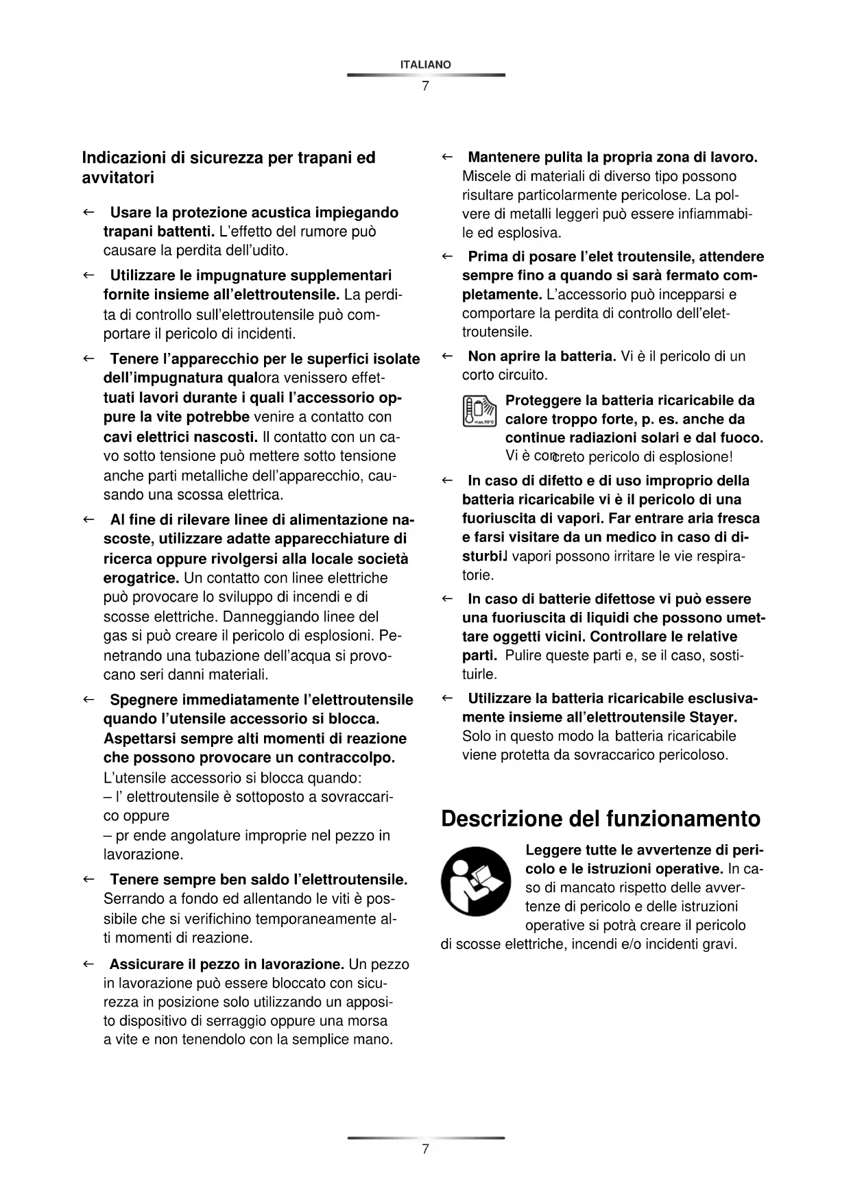 Leggere tutte le avventenze di pericolo e le istruzioni operative. In caso di mancato rispetto delle avventenze di pericolo e delle istruzioni operative si potra create il pericolo