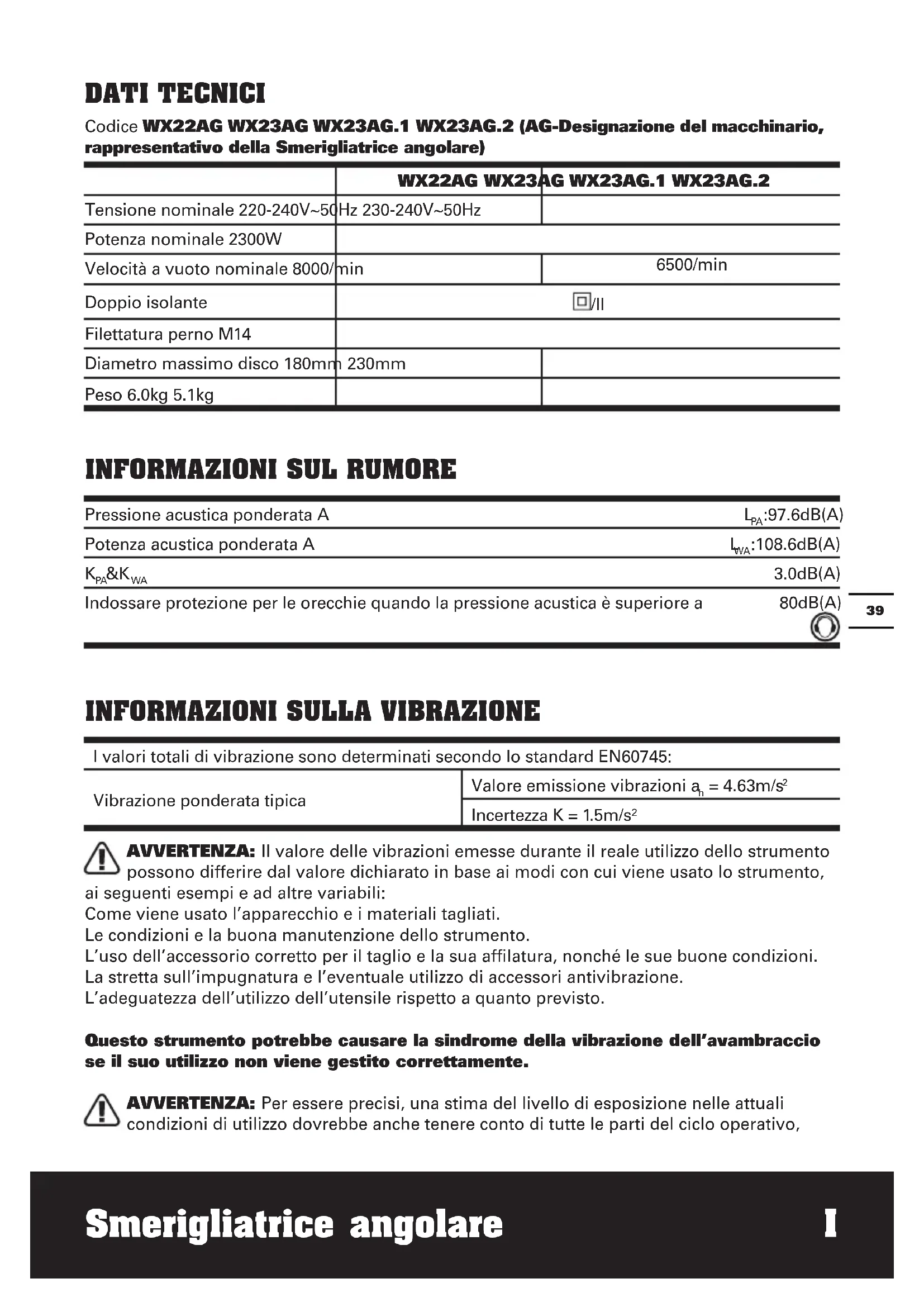 *Accessori illustrati o descritti non fanno necessariamente parte del volume di consegna.3938 Smerigliatrice angolare I DATI TECNICI Codice WX22AG WX23AG WX23AG.1 WX23AG.2 (AG-Designazione del macchinario, rappresentativo della Smerigliatrice angolare) WX22AG WX23AG WX23AG.1 WX23AG.2 Tensione nominale 220-240V~50Hz 230-240V~50Hz Potenza nominale 2300W Velocità a vuoto nominale 8000/min 6500/min Doppio isolante /II Filettatura perno M14 Diametro massimo disco 180mm 230mm Peso 6.0kg 5.1kg