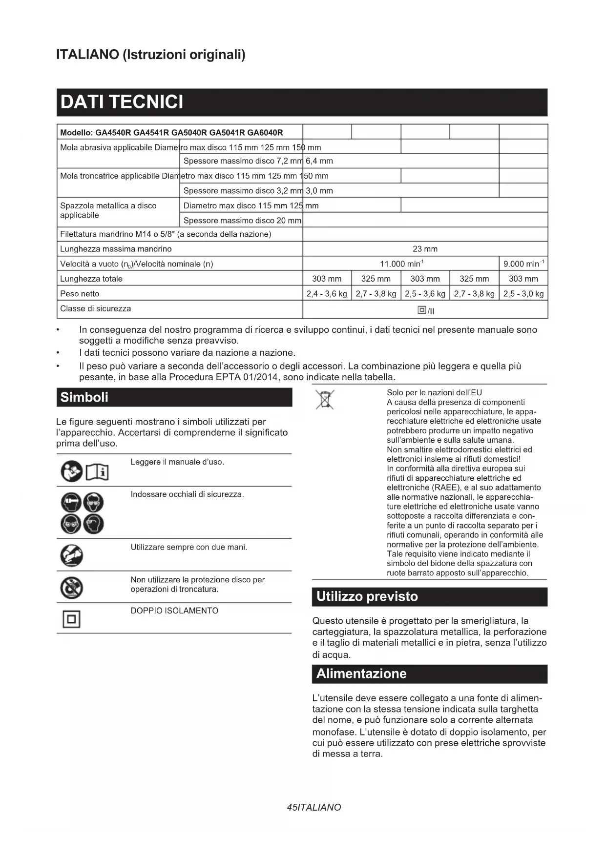 - Il peso può variare a seconda dell’accessorio o degli accessori. La combinazione più leggera e quella più pesante, in base alla Procedura EPTA 01/2014, sono indicate nella tabella. Simboli Le gure seguenti mostrano i simboli utilizzati per l’apparecchio. Accertarsi di comprenderne il signicato prima dell’uso. Leggere il manuale d’uso. Indossare occhiali di sicurezza. Utilizzare sempre con due mani. Non utilizzare la protezione disco per operazioni di troncatura. DOPPIO ISOLAMENTO Solo per le nazioni dell’EU A causa della presenza di componenti pericolosi nelle apparecchiature, le appa- recchiature elettriche ed elettroniche usate potrebbero produrre un impatto negativo sull’ambiente e sulla salute umana. Non smaltire elettrodomestici elettrici ed elettronici insieme ai riuti domestici! In conformità alla direttiva europea sui riuti di apparecchiature elettriche ed elettroniche (RAEE), e al suo adattamento alle normative nazionali, le apparecchia- ture elettriche ed elettroniche usate vanno sottoposte a raccolta dierenziata e con- ferite a un punto di raccolta separato per i riuti comunali, operando in conformità alle normative per la protezione dell’ambiente. Tale requisito viene indicato mediante il simbolo del bidone della spazzatura con ruote barrato apposto sull’apparecchio. Utilizzo previsto Questo utensile è progettato per la smerigliatura, la carteggiatura, la spazzolatura metallica, la perforazione e il taglio di materiali metallici e in pietra, senza l’utilizzo di acqua. Alimentazione L’utensile deve essere collegato a una fonte di alimen- tazione con la stessa tensione indicata sulla targhetta del nome, e può funzionare solo a corrente alternata monofase. L’utensile è dotato di doppio isolamento, per cui può essere utilizzato con prese elettriche sprovviste di messa a terra.46 ITALIANO Rumore Livello tipico di rumore pesato A determinato in base allo standard EN62841-2-3: Modello Livello di pressione sonora (L