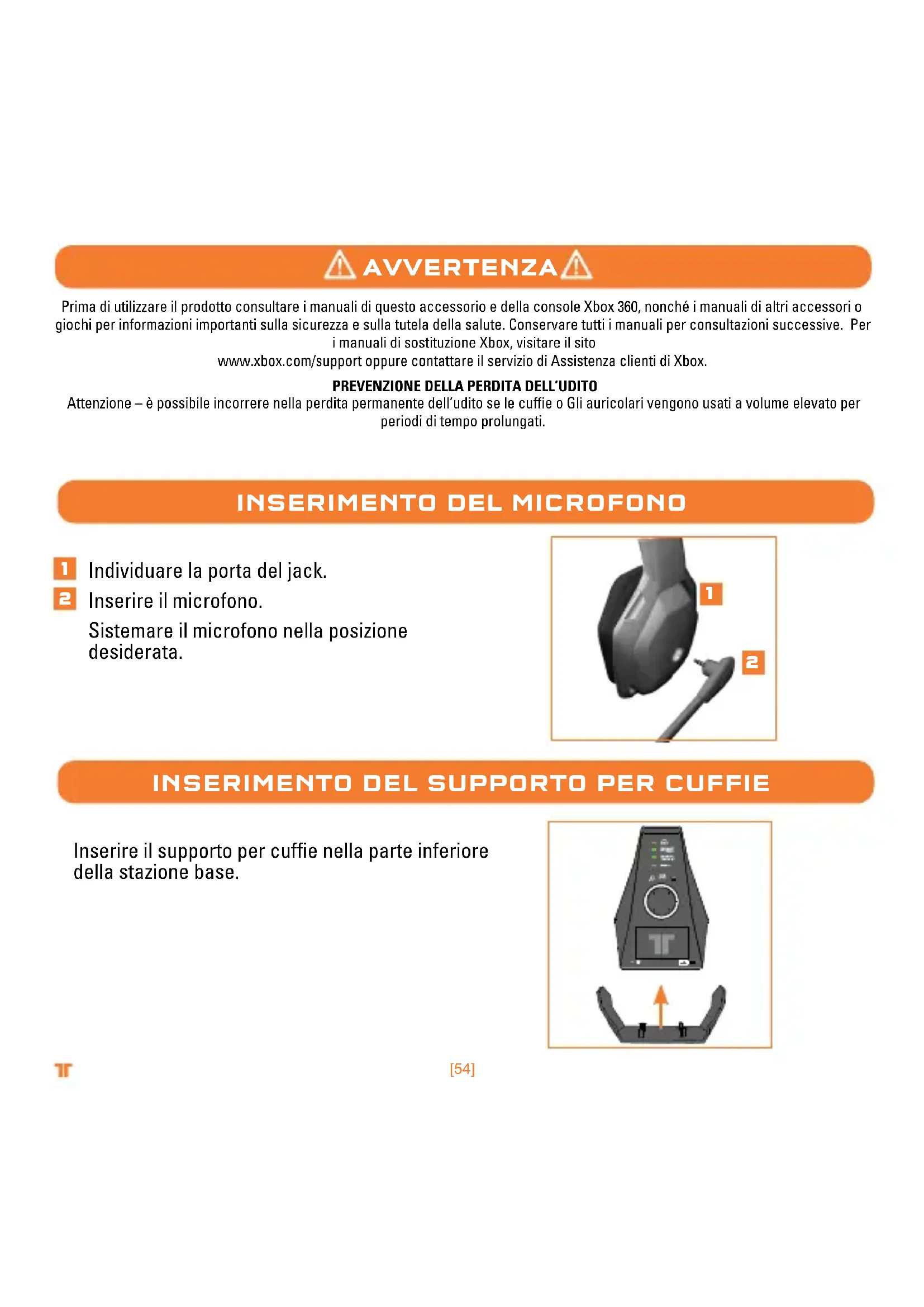 Inserire il supporto per cuffie nella parte inferiore della stazione base. avvertenZa Prima di utilizzare il prodotto consultare i manuali di questo accessorio e della console Xbox 360, nonché i manuali di altri accessori o giochi per informazioni importanti sulla sicurezza e sulla tutela della salute. Conservare tutti i manuali per consultazioni successive. Per i manuali di sostituzione Xbox, visitare il sito www.xbox.com/support oppure contattare il servizio di Assistenza clienti di Xbox.