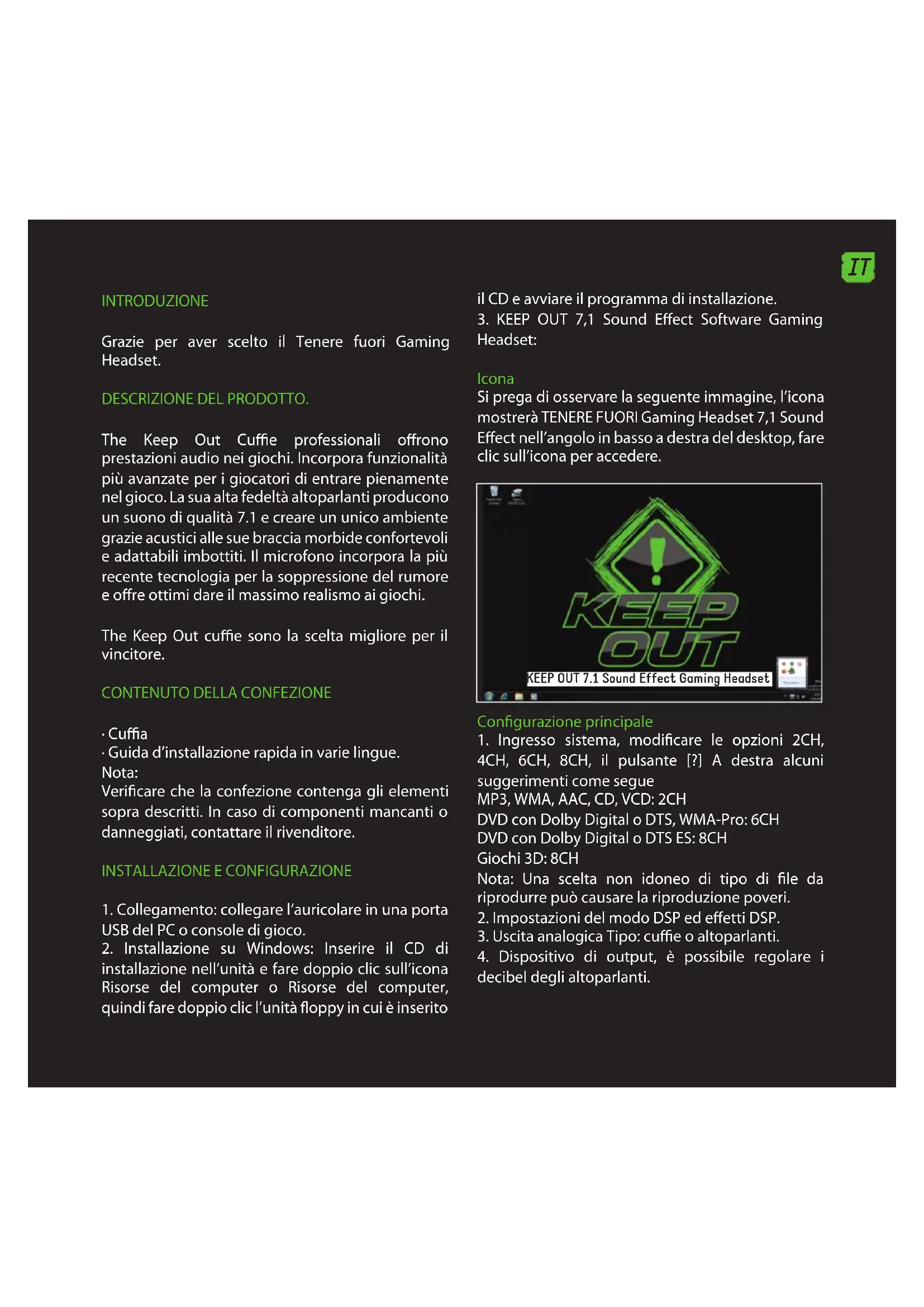 Config principal Monitor Direct Forder/Virus/eqico Información Xear™ Listing Xear™ Setup 4K Motor Audio 3D Xray Verseln Cens Audio 7582206 Controller Audio Controlled de l'host universal USB de la fantsa Incl.RUCH9 .2827 Verseln DirectX DirectX 11 KEEPOUT Virtual 7.1 CH Audio Device Ver: 1.0 Copyright © 2013, KEEPOUT URL: www.keep-out.euSUPPORTO TECNICO