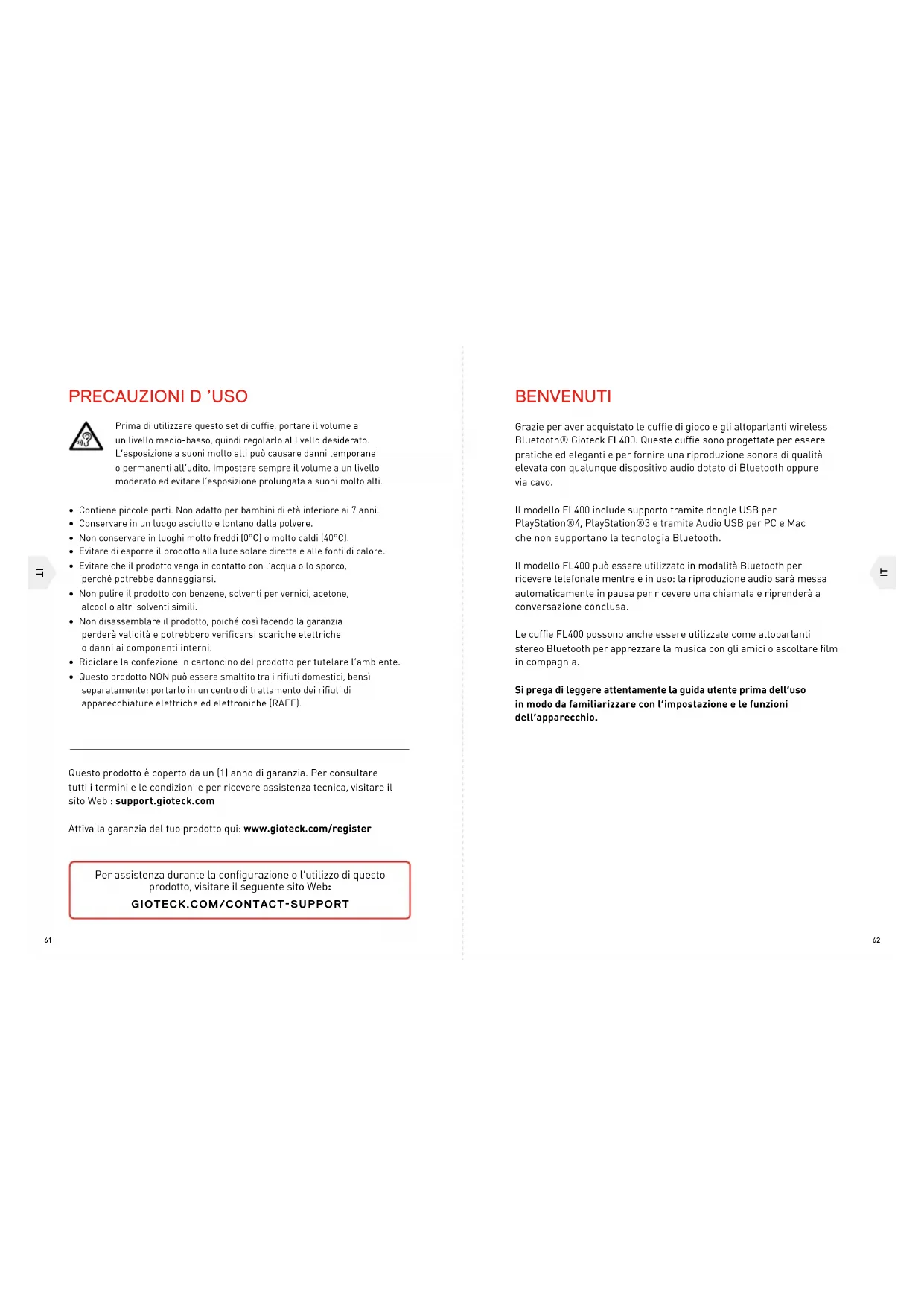BENVENUTI Grazie per aver acquistato le cuffie di gioco e gli altoparlanti wireless Bluetooth® Gioteck FL400. Queste cuffie sono progettate per essere pratiche ed eleganti e per fornire una riproduzione sonora di qualità elevata con qualunque dispositivo audio dotato di Bluetooth oppure via cavo. Il modello FL400 include supporto tramite dongle USB per PlayStation®4, PlayStation®3 e tramite Audio USB per PC e Mac che non supportano la tecnologia Bluetooth. Il modello FL400 può essere utilizzato in modalità Bluetooth per ricevere telefonate mentre è in uso: la riproduzione audio sarà messa automaticamente in pausa per ricevere una chiamata e riprenderà a conversazione conclusa. Le cuffie FL400 possono anche essere utilizzate come altoparlanti stereo Bluetooth per apprezzare la musica con gli amici o ascoltare film in compagnia. Si prega di leggere attentamente la guida utente prima dell’uso in modo da familiarizzare con l’impostazione e le funzioni dell’apparecchio. Prima di utilizzare questo set di cuffie, portare il volume a un livello medio-basso, quindi regolarlo al livello desiderato. L’esposizione a suoni molto alti può causare danni temporanei o permanenti all’udito. Impostare sempre il volume a un livello moderato ed evitare l’esposizione prolungata a suoni molto alti.