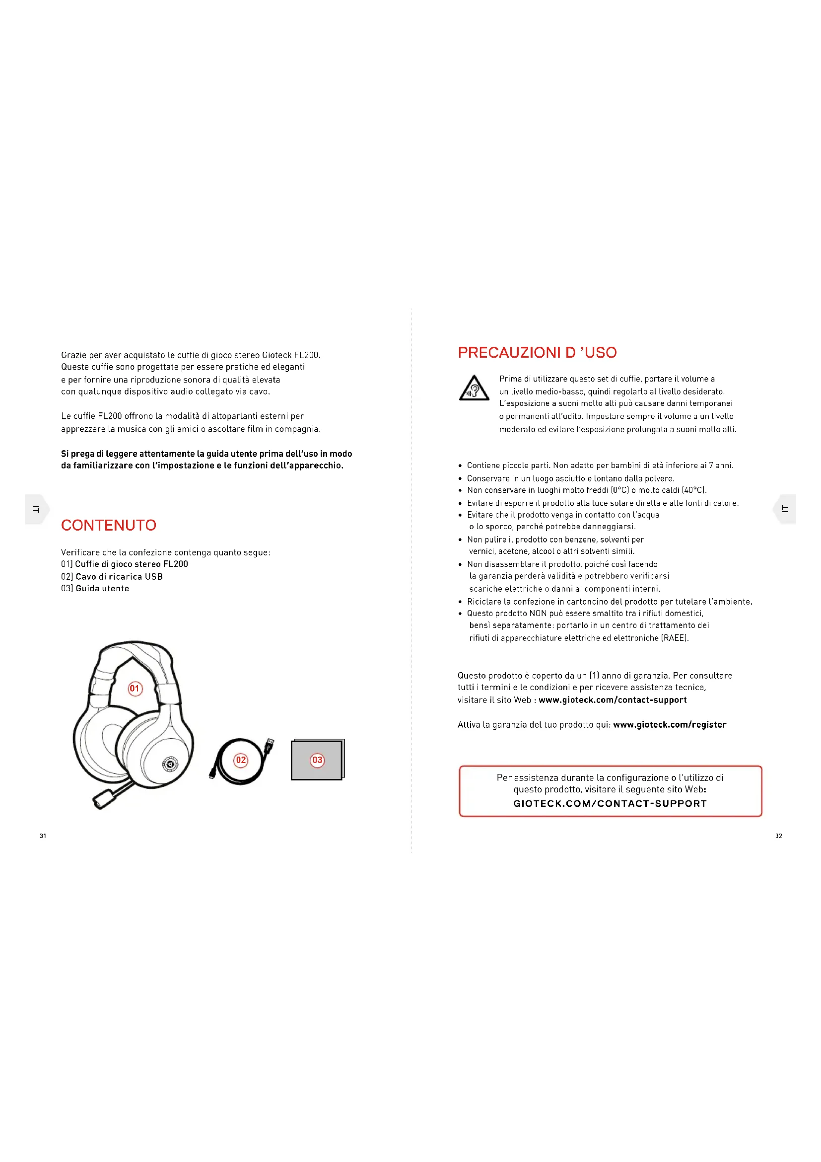 Grazie per aver acquistato le cuffie di gioco stereo Gioteck FL200. Queste cuffie sono progettate per essere pratiche ed eleganti e per fornire una riproduzione sonora di qualità elevata con qualunque dispositivo audio collegato via cavo. Le cuffie FL200 offrono la modalità di altoparlanti esterni per apprezzare la musica con gli amici o ascoltare film in compagnia. Si prega di leggere attentamente la guida utente prima dell’uso in modo da familiarizzare con l’impostazione e le funzioni dell’apparecchio. CONTENUTO Verificare che la confezione contenga quanto segue: 01] Cuffie di gioco stereo FL200 02] Cavo di ricarica USB 03] Guida utente Prima di utilizzare questo set di cuffie, portare il volume a un livello medio-basso, quindi regolarlo al livello desiderato. L’esposizione a suoni molto alti può causare danni temporanei o permanenti all’udito. Impostare sempre il volume a un livello moderato ed evitare l’esposizione prolungata a suoni molto alti.