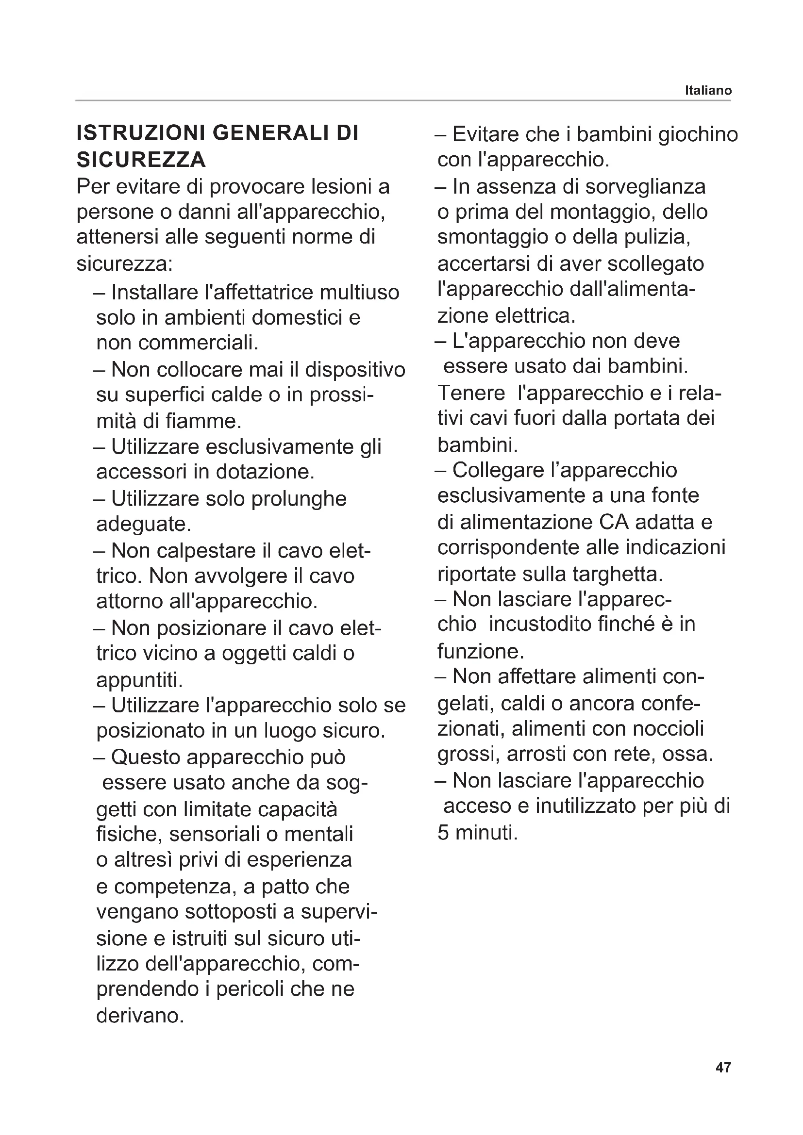 SICUREZZA Per evitare di provocare lesioni a persone o danni all'apparecchio, attenersi alle seguenti norme di sicurezza: – Installare l'aettatrice multiuso solo in ambienti domestici e non commerciali. – Non collocare mai il dispositivo su superci calde o in prossi- mità di amme. – Utilizzare esclusivamente gli accessori in dotazione. – Utilizzare solo prolunghe adeguate. – Non calpestare il cavo elet- trico. Non avvolgere il cavo attorno all'apparecchio. – Non posizionare il cavo elet- trico vicino a oggetti caldi o appuntiti. – Utilizzare l'apparecchio solo se posizionato in un luogo sicuro. – Questo apparecchio può essere usato anche da sog- getti con limitate capacità siche, sensoriali o mentali o altresì privi di esperienza e competenza, a patto che vengano sottoposti a supervi- sione e istruiti sul sicuro uti- lizzo dell'apparecchio, com- prendendo i pericoli che ne derivano. – Evitare che i bambini giochino con l'apparecchio. – In assenza di sorveglianza o prima del montaggio, dello smontaggio o della pulizia, accertarsi di aver scollegato l'apparecchio dall'alimenta- zione elettrica. – L'apparecchio non deve essere usato dai bambini. Tenere l'apparecchio e i rela- tivi cavi fuori dalla portata dei bambini. – Collegare l’apparecchio esclusivamente a una fonte di alimentazione CA adatta e corrispondente alle indicazioni riportate sulla targhetta. – Non lasciare l'apparec- chio incustodito nché è in funzione. – Non aettare alimenti con- gelati, caldi o ancora confe- zionati, alimenti con noccioli grossi, arrosti con rete, ossa. – Non lasciare l'apparecchio acceso e inutilizzato per più di 5 minuti. Italiano48 Rischio di folgorazione – Nel caso di malfunzionamento, prima di ogni intervento di pulizia o quando l'apparecchio non viene utilizzato, disconnet- terlo dalla presa di alimenta- zione. Eseguire questa opera- zione aerrando la presa, non il cavo. – Non immergere mai l'ap- parecchio in acqua. Tenere l'apparecchio lontano da qualsiasi fonte di umidità. Se l'apparecchio dovesse cadere accidentalmente in acqua, staccare immediatamente la spina, quindi estrarlo dall'ac- qua. Prima di riutilizzare l'ap- parecchio, si consiglia di farlo controllare accuratamente in uno dei centri di assistenza autorizzati. – Non utilizzare l'apparecchio con le mani umide. Evitare di utilizzare l'apparecchio quando questo è umido o quando il pavimento è bagnato. Non uti- lizzare l'apparecchio all'aperto. – In caso di danneggiamenti ai componenti dell’apparecchio, cessarne immediatamente il funzionamento e mettersi in contatto con il servizio clienti ritter. – Se il cavo elettrico viene danneggiato, per motivi di sicurezza la sostituzione deve essere eettuata dal produt- tore, dal servizio di assistenza del produttore o da personale altrettanto qualicato. Pericolo di lesioni – Utilizzare sempre il carrello o il pressasalumi, a meno che la forma o la grandezza dell'alimento da aettare non lo impediscano. – Spegnere l'apparecchio e scollegarlo dall'alimentazione elettrica prima di procedere alla sostituzione di accessori o componenti aggiuntivi che sono in movimento quando la macchina è in funzione. – La lama è molto alata. – Non toccare mai la lama men- tre l'apparecchio è in funzione. – Spegnere l'apparecchio prima di pulirlo, staccarlo dalla presa e portare la manopola di regolazione dello spessore del taglio sulla posizione "0". – Dopo lo spegnimento, la lama continua a girare per alcuni secondi. Italiano49 Aprire le pagine dei graci nella copertina anteriore e posteriore del libretto. Leggere attentamente le istru- zioni prima di mettere in funzione l'apparecchio. Conservare le istruzioni e, in caso di cessione dell'apparecchio, consegnarle al nuovo proprietario. Sono tuttavia sempre disponibili istruzioni aggiornate nel sito www.ritterwerk.de. UTILIZZO PREVISTO Questa aettatrice multiuso consente di aettare alimenti per uso domestico. L’aettatrice multiuso è idonea al contatto con alimenti. L'utilizzo improprio o errato può causare gravi lesioni personali o danni all'apparecchio. In questi casi la garanzia perde la validità e l'azienda declina ogni forma di responsabilità.