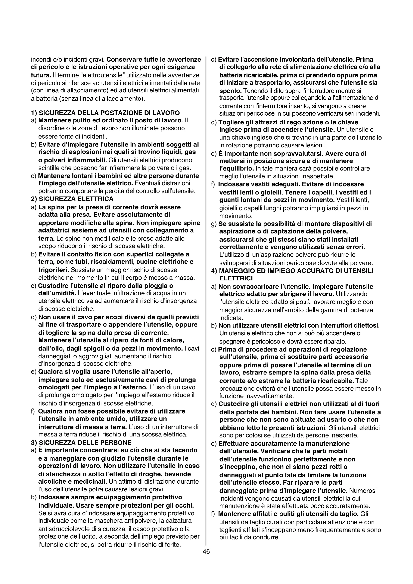a) Mantenere pulito ed ordinato il posto di lavoro. Il disordine o le zone di lavoro non illuminate possono essere fonte di incidenti. b) Evitare d’impiegare l’utensile in ambienti soggetti al rischio di esplosioni nei quali si trovino liquidi, gas o polveri infiammabili. Gli utensili elettrici producono scintille che possono far inammare la polvere o i gas. c) Mantenere lontani i bambini ed altre persone durante l’impiego dell’utensile elettrico. Eventuali distrazioni potranno comportare la perdita del controllo sull’utensile.