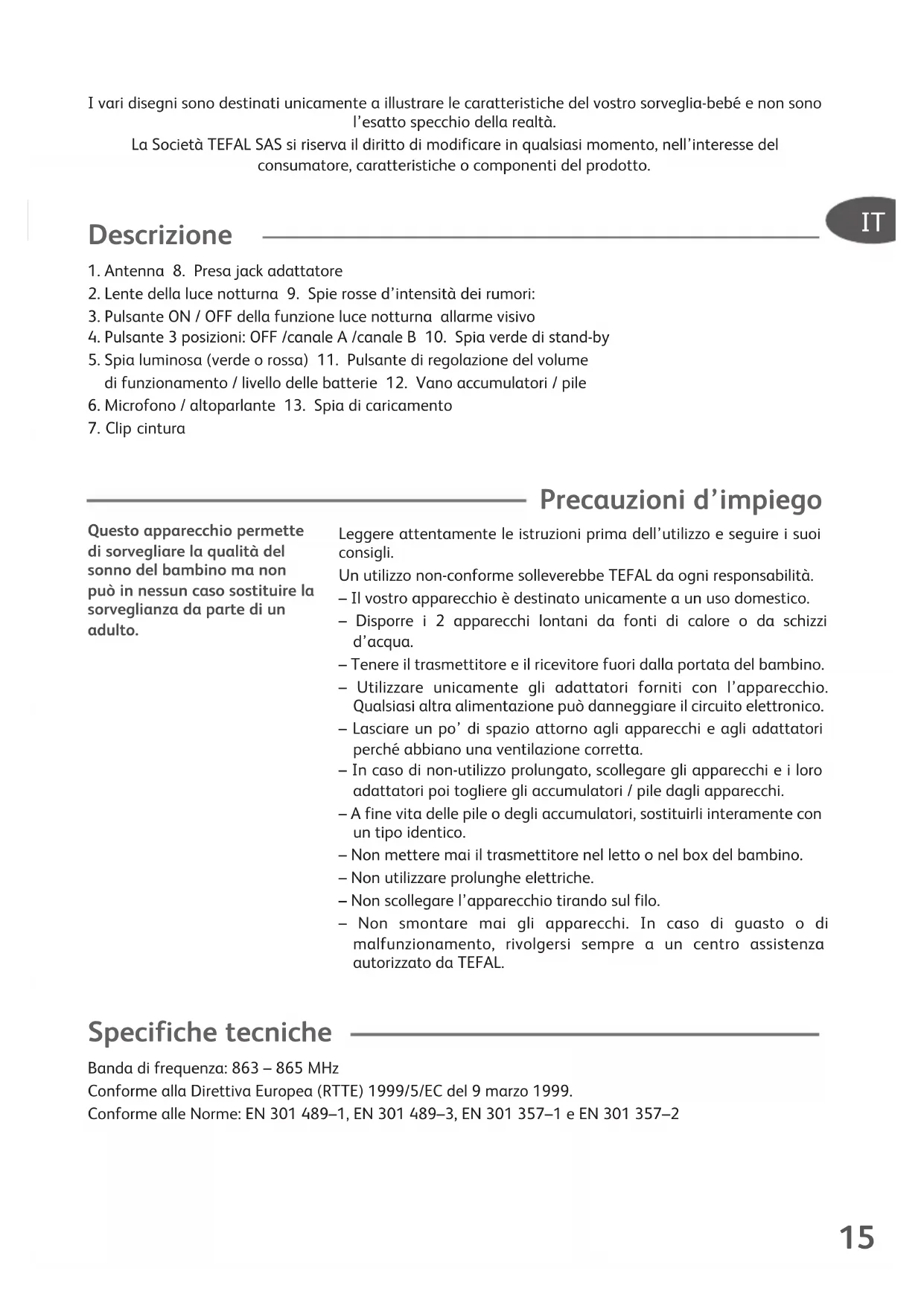 Precauzioni d’impiego Leggere attentamente le istruzioni prima dell’utilizzo e seguire i suoi consigli. Un utilizzo non-conforme solleverebbe TEFAL da ogni responsabilità. – Il vostro apparecchio è destinato unicamente a un uso domestico. – Disporre i 2 apparecchi lontani da fonti di calore o da schizzi d’acqua. – Tenere il trasmettitore e il ricevitore fuori dalla portata del bambino. – Utilizzare unicamente gli adattatori forniti con l’apparecchio. Qualsiasi altra alimentazione può danneggiare il circuito elettronico. – Lasciare un po’ di spazio attorno agli apparecchi e agli adattatori perché abbiano una ventilazione corretta. – In caso di non-utilizzo prolungato, scollegare gli apparecchi e i loro adattatori poi togliere gli accumulatori / pile dagli apparecchi. – A fine vita delle pile o degli accumulatori, sostituirli interamente con un tipo identico. – Non mettere mai il trasmettitore nel letto o nel box del bambino. – Non utilizzare prolunghe elettriche. – Non scollegare l’apparecchio tirando sul filo. – Non smontare mai gli apparecchi. In caso di guasto o di malfunzionamento, rivolgersi sempre a un centro assistenza autorizzato da TEFAL. Specifiche tecniche Banda di frequenza: 863 – 865 MHz Conforme alla Direttiva Europea (RTTE) 1999/5/EC del 9 marzo 1999. Conforme alle Norme: EN 301 489–1, EN 301 489–3, EN 301 357–1 e EN 301 357–2 Questo apparecchio permette di sorvegliare la qualità del sonno del bambino ma non può in nessun caso sostituire la sorveglianza da parte di un adulto.