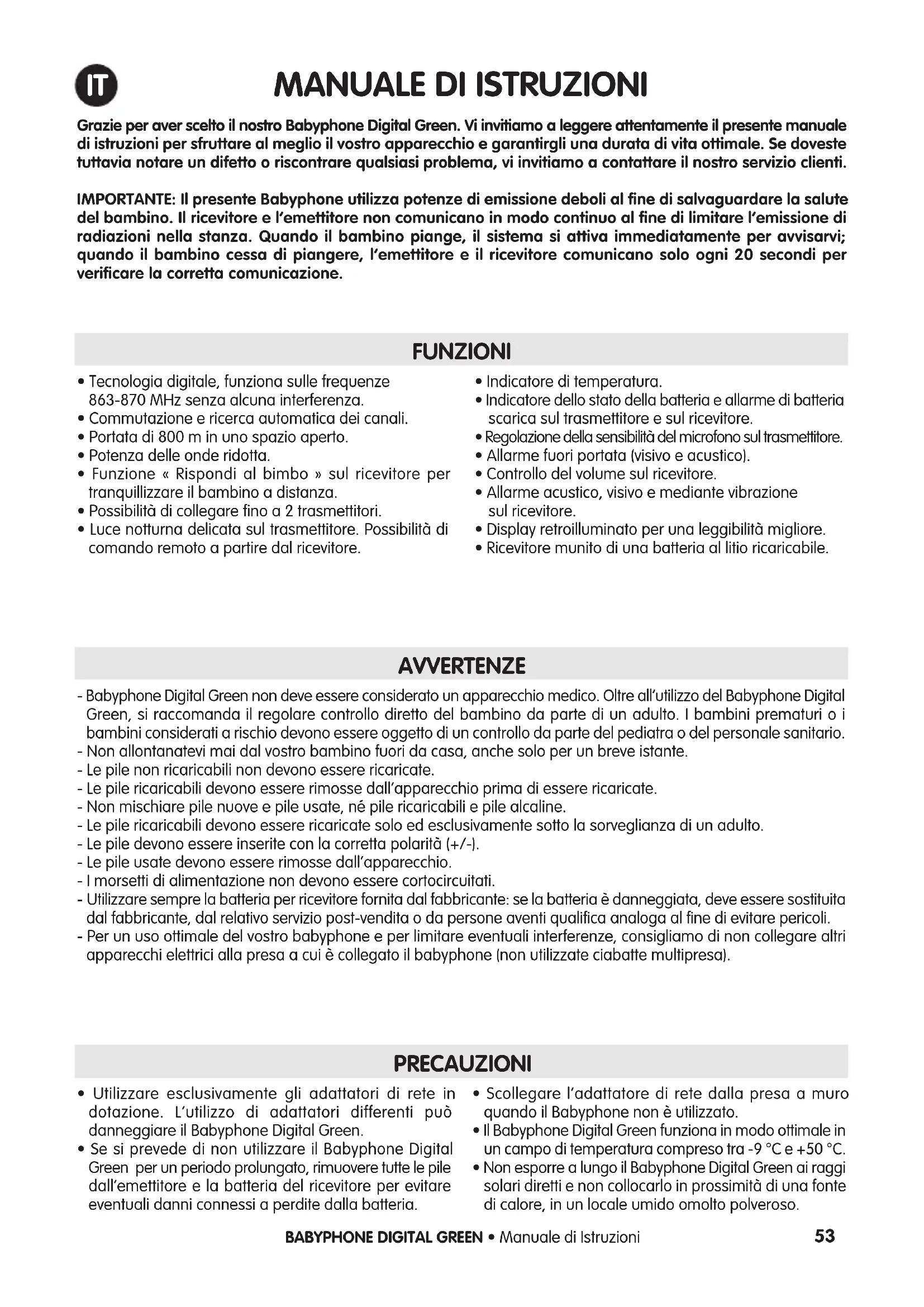 AVVERTENZE - Babyphone Digital Green non deve essere considerato un apparecchio medico. Oltre all’utilizzo del Babyphone Digital Green, si raccomanda il regolare controllo diretto del bambino da parte di un adulto. I bambini prematuri o i bambini considerati a rischio devono essere oggetto di un controllo da parte del pediatra o del personale sanitario. - Non allontanatevi mai dal vostro bambino fuori da casa, anche solo per un breve istante. - Le pile non ricaricabili non devono essere ricaricate. - Le pile ricaricabili devono essere rimosse dall’apparecchio prima di essere ricaricate. - Non mischiare pile nuove e pile usate, né pile ricaricabili e pile alcaline. - Le pile ricaricabili devono essere ricaricate solo ed esclusivamente sotto la sorveglianza di un adulto. - Le pile devono essere inserite con la corretta polarità (+/-). - Le pile usate devono essere rimosse dall’apparecchio. - I morsetti di alimentazione non devono essere cortocircuitati. - Utilizzare sempre la batteria per ricevitore fornita dal fabbricante: se la batteria è danneggiata, deve essere sostituita dal fabbricante, dal relativo servizio post-vendita o da persone aventi qualifica analoga al fine di evitare pericoli. - Per un uso ottimale del vostro babyphone e per limitare eventuali interferenze, consigliamo di non collegare altri apparecchi elettrici alla presa a cui è collegato il babyphone (non utilizzate ciabatte multipresa).