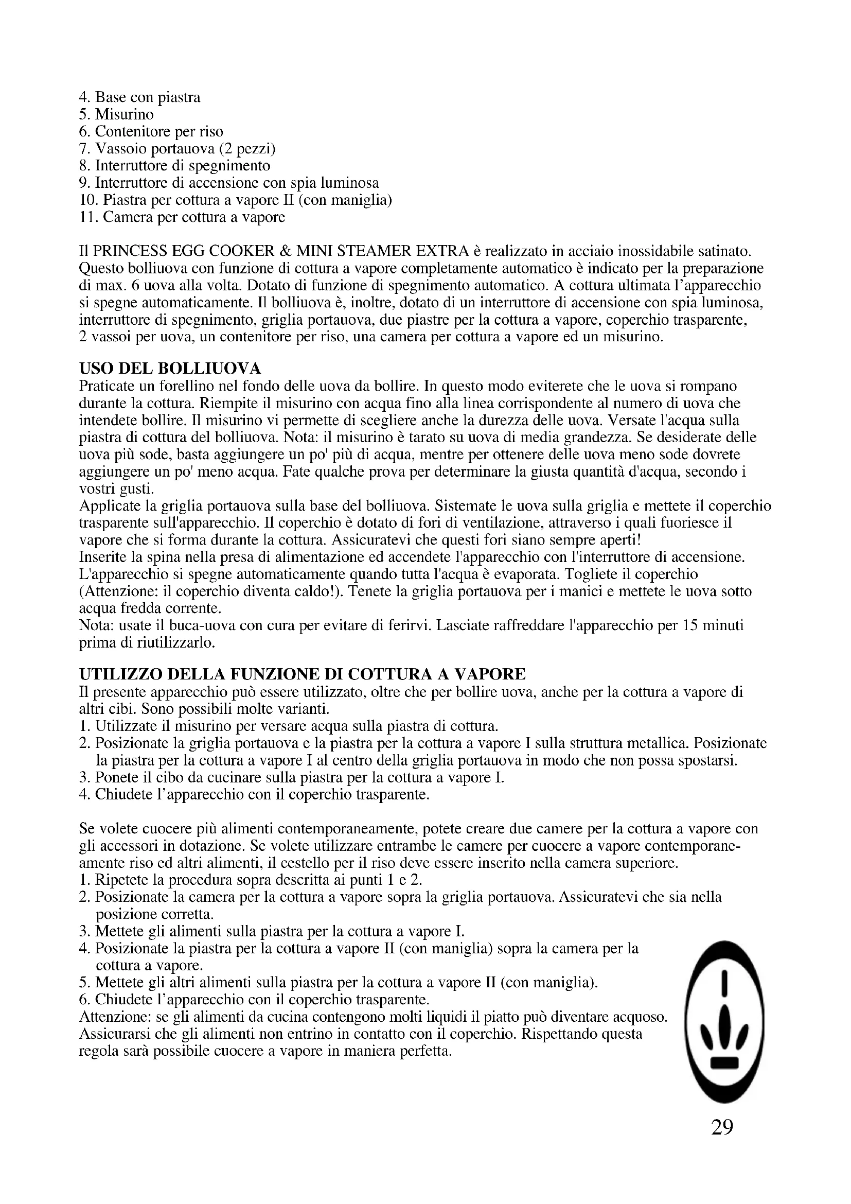 La superficie esterna della base può essere pulita con un panno umido (non immergete mai la base in acqua o in altri liquidi). Anche gli accessori possono essere puliti con un panno umido. Se necessario possono essere lavati anche con acqua calda e detersivo. Dopo ogni uso, rimuovete i depositi di calcare dalla piastra di cottura. In caso di depositi di calcare consistenti, potete versare sulla piastra una soluzione al 50% di acqua e 50% di aceto. In tal caso non mettete la griglia portauova ed il coperchio sull'apparecchio. Inserite la spina nella presa di alimentazione e lasciate agire la soluzione per un paio di minuti. Ripetete l'operazione un paio di volte. Al termine pulite accuratamente la piastra con acqua. SUGGERIMENTI PRINCESS - Non immergete mai la base dell'apparecchio in acqua, o in altri liquidi. - Togliete sempre la spina dalla presa di alimentazione prima di pulire l’apparecchio o in caso di funzionamento difettoso. - Non ostruite mai i fori di ventilazione del coperchio. - Ricordatevi che il vapore caldo che si forma sotto il coperchio fuoriesce dai fori di ventilazione. - Il coperchio diventa molto caldo: non aprirlo fino al termine della cottura. - Assicurarsi che l'apparecchio sia completamente raffreddato prima di spostarlo. - Lasciare raffreddare l'apparecchio per almeno 15 minuti prima di riutilizzarlo. - Il bordo interno e tutti gli accessori diventano molto caldi: assicuratevi che i bambini non possano toccarli e maneggiateli con cura.31 - Assicuratevi che l’apparecchio non si trovi mai troppo vicino al bordo del tavolo o del ripiano, in modo da evitare che possa cadere accidentalmente; assicuratevi inoltre che nessuno possa inciampare o rimanere impigliato nel cavo di alimentazione. - Non usate l'apparecchio se è difettoso o se il cavo di alimentazione è danneggiato, ma inviatelo al nostro centro di assistenza. - Non posizionate l’apparecchio su piastre di cottura o in prossimità di esso o di altre fonti di calore. - Collegate l’apparecchio unicamente ad una presa di alimentazione con messa e terra. - Questo apparecchio è destinato al solo uso domestico. - Controllare i bambini affinché non giochino con l’apparecchio. - L’uso di questo apparecchio da parte di bambini o persone con problemi fisici, sensoriali, mentali o motori, o con scarsa esperienza o conoscenza, può causare gravi pericoli. Le persone responsabili per la loro sicurezza devono dare loro istruzioni chiare o supervisionare l’uso dell’apparecchio. RICETTE UOVA SODE CON WURSTEL E ASPARAGI (1 PORZIONE) 1 uovo (rotto in contenitore in alluminio)