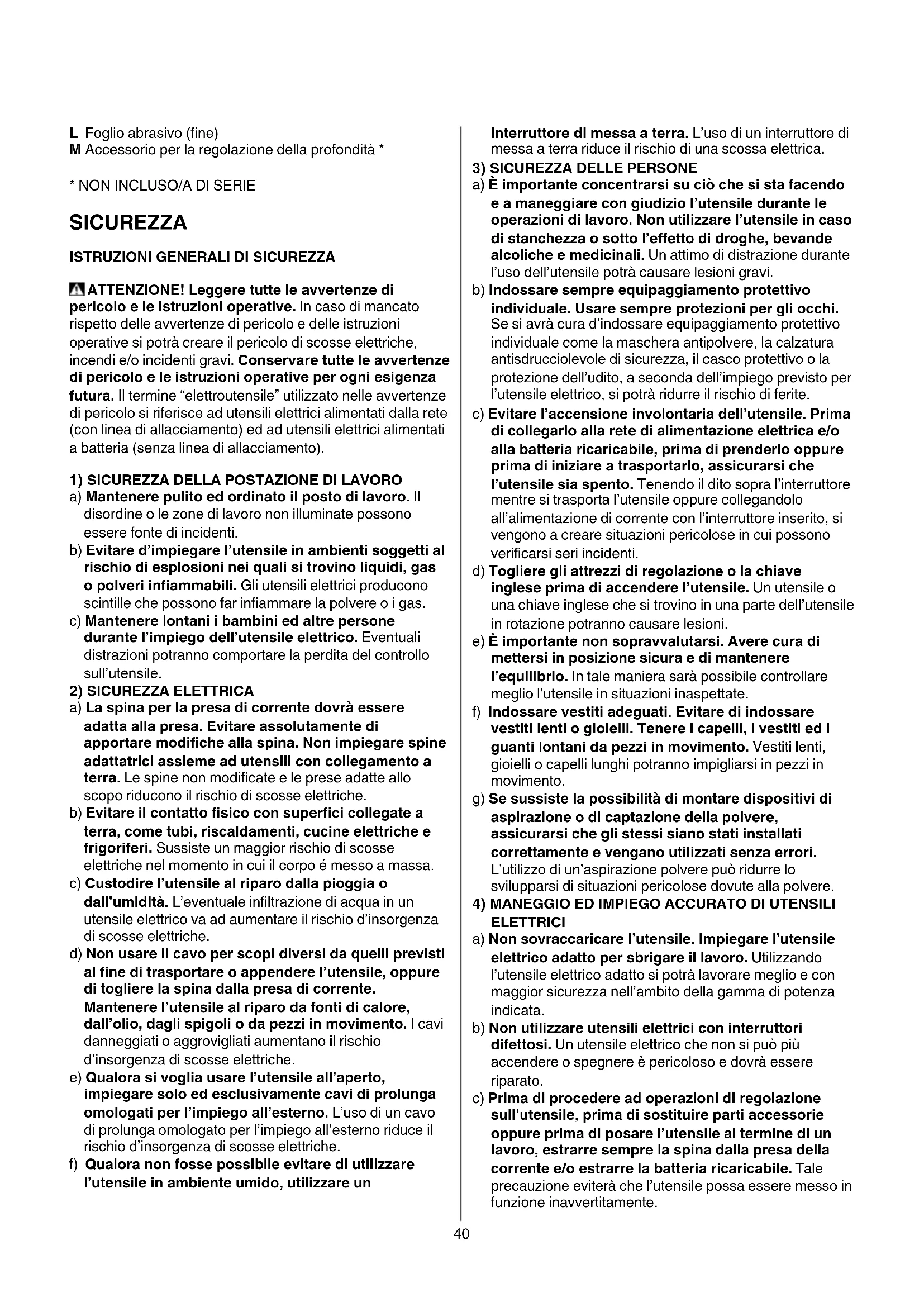 ELETTRICI a) Non sovraccaricare l’utensile. Impiegare l’utensile elettrico adatto per sbrigare il lavoro. Utilizzando l’utensile elettrico adatto si potrà lavorare meglio e con maggior sicurezza nell’ambito della gamma di potenza indicata. b) Non utilizzare utensili elettrici con interruttori difettosi. Un utensile elettrico che non si può più accendere o spegnere è pericoloso e dovrà essere riparato. c) Prima di procedere ad operazioni di regolazione sull’utensile, prima di sostituire parti accessorie oppure prima di posare l’utensile al termine di un lavoro, estrarre sempre la spina dalla presa della corrente e/o estrarre la batteria ricaricabile. Tale precauzione eviterà che l’utensile possa essere messo in funzione inavvertitamente.41 d) Custodire gli utensili elettrici non utilizzati al di fuori della portata dei bambini. Non fare usare l’utensile a persone che non sono abituate ad usarlo o che non abbiano letto le presenti istruzioni. Gli utensili elettrici sono pericolosi se utilizzati da persone inesperte. e) Effettuare accuratamente la manutenzione dell’utensile. Verificare che le parti mobili dell’utensile funzionino perfettamente e non s’inceppino, che non ci siano pezzi rotti o danneggiati al punto tale da limitare la funzione dell’utensile stesso. Far riparare le parti danneggiate prima d’impiegare l’utensile. Numerosi incidenti vengono causati da utensili elettrici la cui manutenzione è stata eettuata poco accuratamente. f) Mantenere affilati e puliti gli utensili da taglio. Gli utensili da taglio curati con particolare attenzione e con taglienti alati s’inceppano meno frequentemente e sono più facili da condurre. g) Utilizzare utensili elettrici, accessori, attrezzi, ecc. in conformità con le presenti istruzioni. Osservare le condizioni di lavoro ed il lavoro da eseguirsi durante l’impiego. L’impiego di utensili elettrici per usi diversi da quelli consentiti potrà dar luogo a situazioni di pericolo.