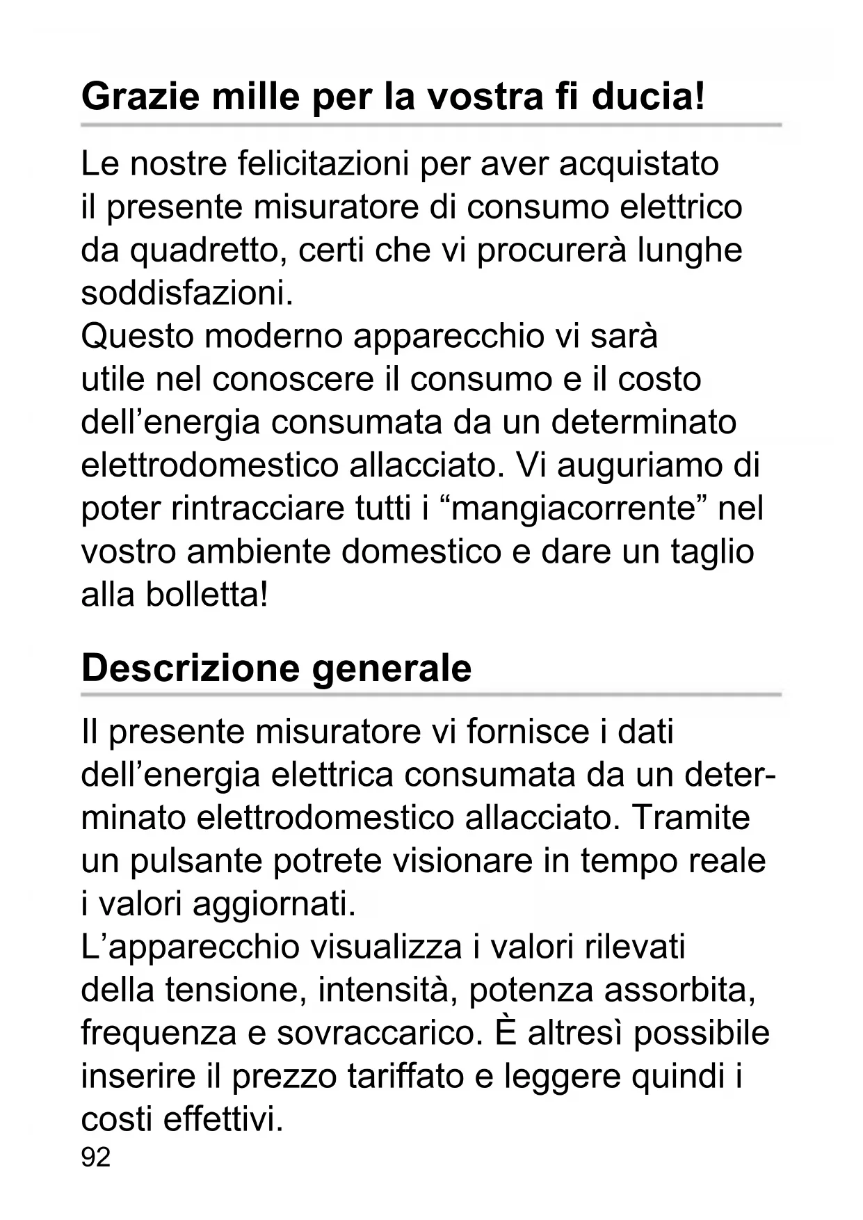- L’apparecchio è indicato unicamente alla tensione alternata 230 V/50 Hz per un rilevamento di potenza fi no a max. 2300 Watt. Osservare al riguardo i dati tecnici, v. Sommario.