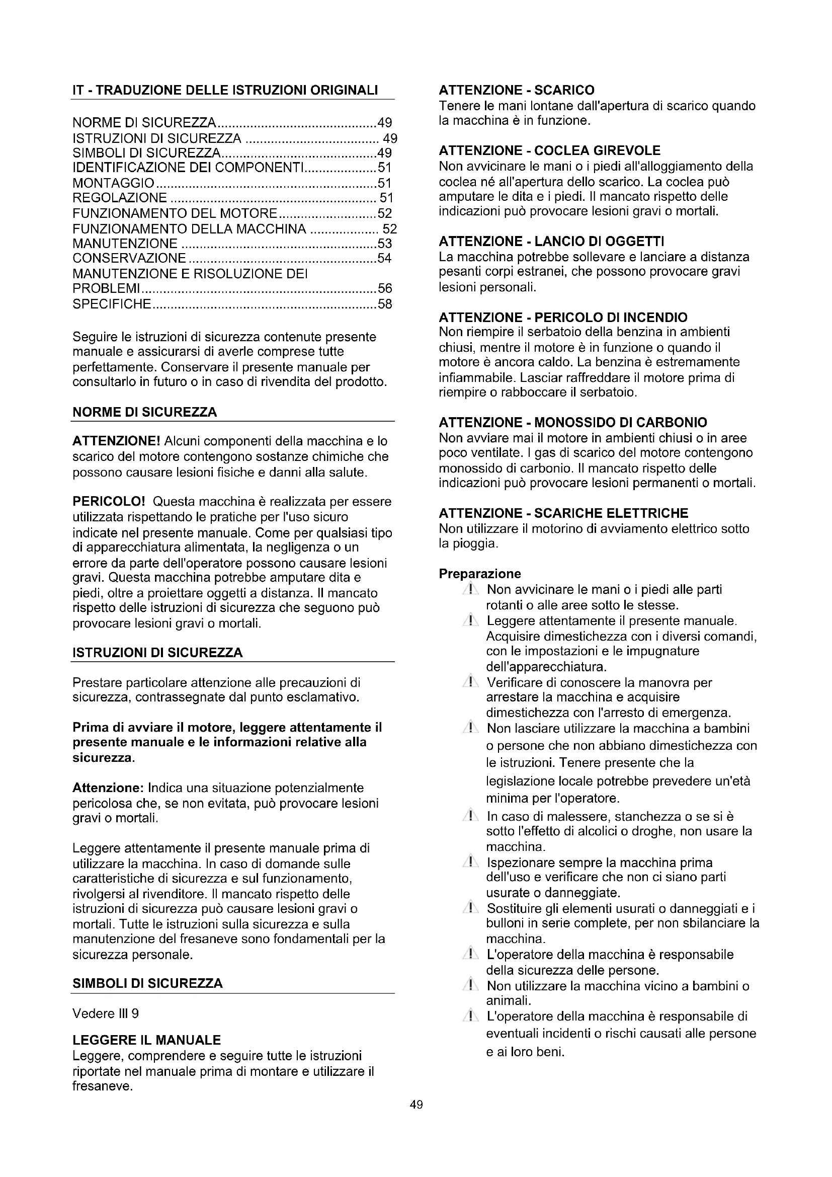 Leggere attendamente il presente manuale prima di utilizzare la macchina. In caso di domande sulle caratteristiche di sicurezza e sul funzionamento, rivolgersi al rivenditore. Il mancato rispetto delle istruzioni di sicurezza cui causare lesioni gravi o mortali. Tutte le istruzioni sulla sicurezza e sulla manutenzione del Fresaneve sono fondamentali per la sicurezza personale.