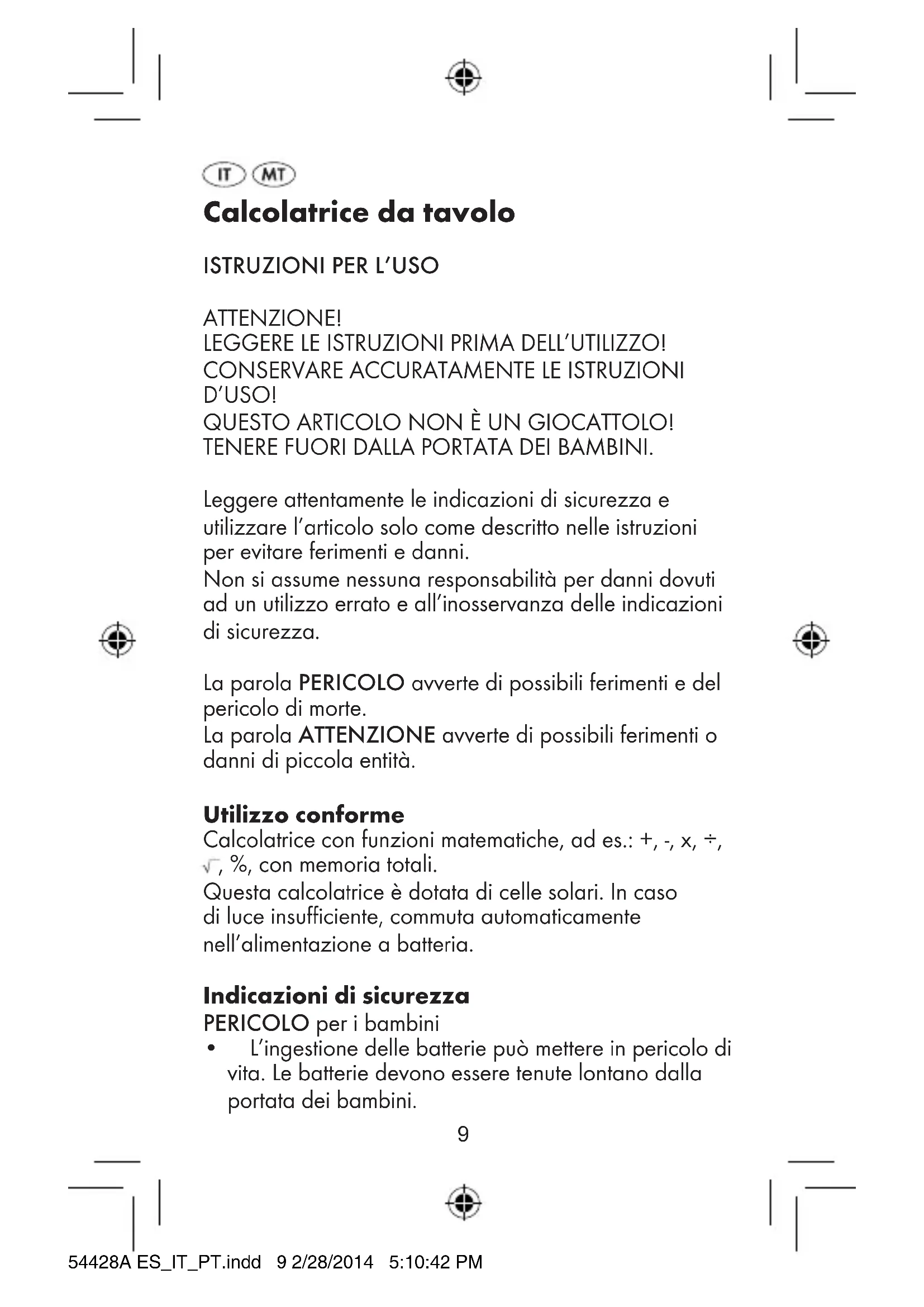 D’USO! QUESTO ARTICOLO NON È UN GIOCATTOLO! TENERE FUORI DALLA PORTATA DEI BAMBINI. Leggere attentamente le indicazioni di sicurezza e utilizzare l’articolo solo come descritto nelle istruzioni per evitare ferimenti e danni. Non si assume nessuna responsabilità per danni dovuti ad un utilizzo errato e all’inosservanza delle indicazioni di sicurezza. La parola PERICOLO avverte di possibili ferimenti e del pericolo di morte. La parola ATTENZIONE avverte di possibili ferimenti o danni di piccola entità. Utilizzo conforme Calcolatrice con funzioni matematiche, ad es.: +, -, x, ÷, , %, con memoria totali. Questa calcolatrice è dotata di celle solari. In caso di luce insufficiente, commuta automaticamente nell’alimentazione a batteria. Indicazioni di sicurezza PERICOLO per i bambini