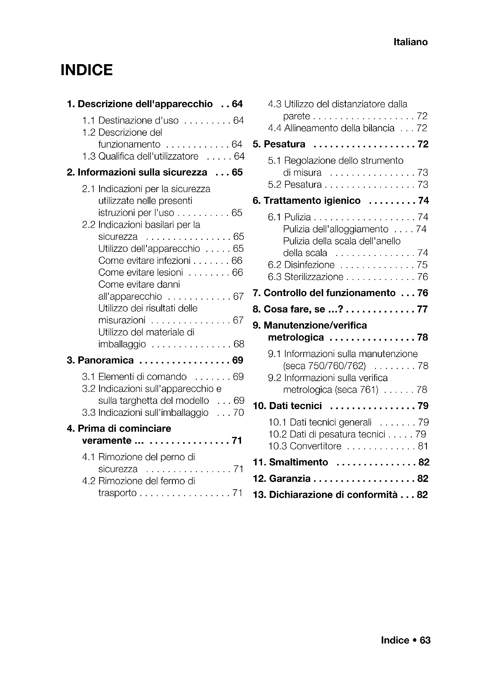 9.1 Informazioni sulla manutenzione (seca 750/760/762) .....78