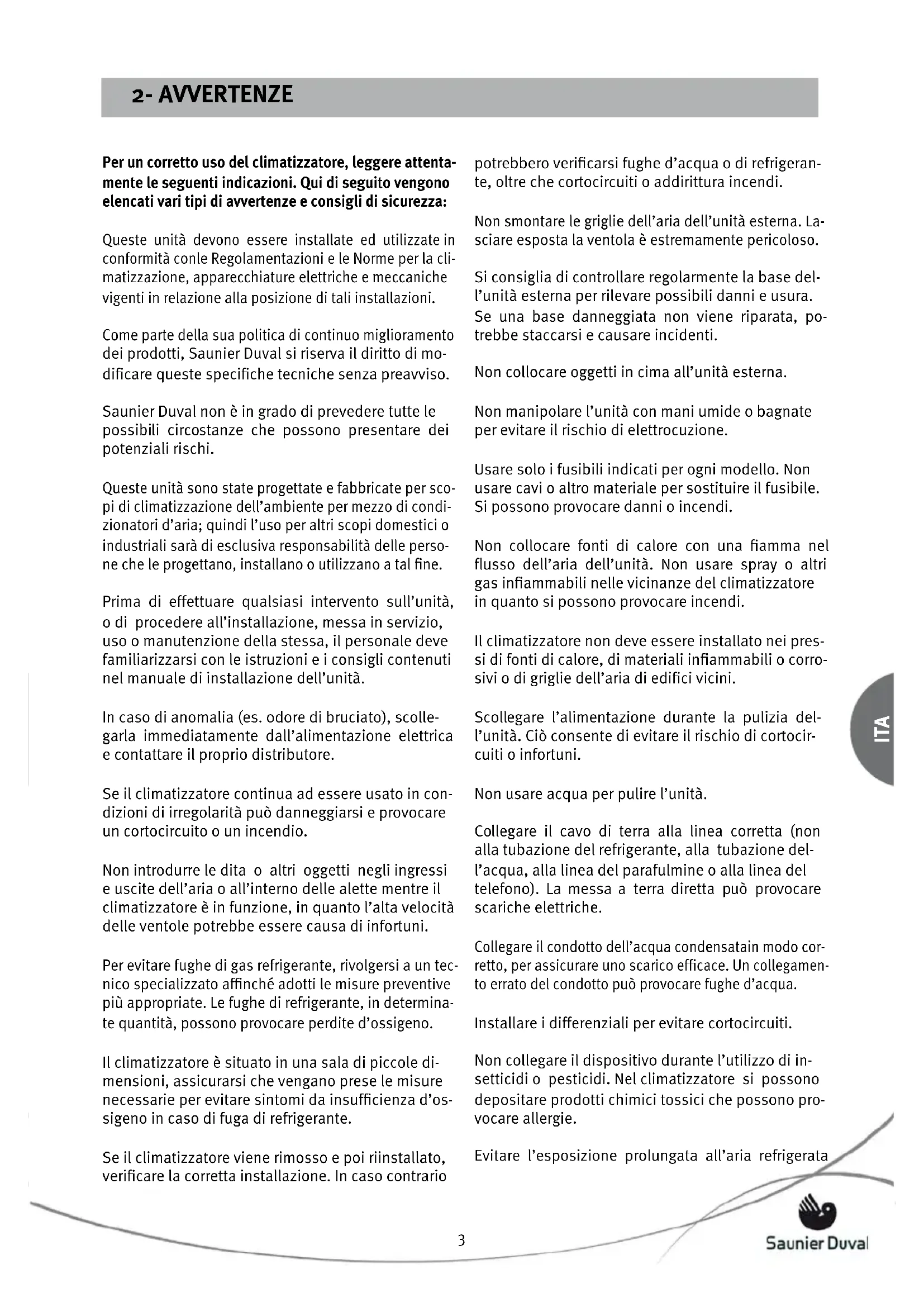 Per un corretto uso del climatizzatore, leggere attenta- mente le seguenti indicazioni. Qui di seguito vengono elencati vari tipi di avvertenze e consigli di sicurezza: Queste unità devono essere installate ed utilizzate in conformità conle Regolamentazioni e le Norme per la cli- matizzazione, apparecchiature elettriche e meccaniche vigenti in relazione alla posizione di tali installazioni. Come parte della sua politica di continuo miglioramento dei prodotti, Saunier Duval si riserva il diritto di mo- dificare queste specifiche tecniche senza preavviso. Saunier Duval non è in grado di prevedere tutte le possibili circostanze che possono presentare dei potenziali rischi. Queste unità sono state progettate e fabbricate per sco- pi di climatizzazione dell’ambiente per mezzo di condi- zionatori d’aria; quindi l’uso per altri scopi domestici o industriali sarà di esclusiva responsabilità delle perso- ne che le progettano, installano o utilizzano a tal fine. Prima di effettuare qualsiasi intervento sull’unità, o di procedere all’installazione, messa in servizio, uso o manutenzione della stessa, il personale deve familiarizzarsi con le istruzioni e i consigli contenuti nel manuale di installazione dell’unità. In caso di anomalia (es. odore di bruciato), scolle- garla immediatamente dall’alimentazione elettrica e contattare il proprio distributore. Se il climatizzatore continua ad essere usato in con- dizioni di irregolarità può danneggiarsi e provocare un cortocircuito o un incendio. Non introdurre le dita o altri oggetti negli ingressi e uscite dell’aria o all’interno delle alette mentre il climatizzatore è in funzione, in quanto l’alta velocità delle ventole potrebbe essere causa di infortuni. Per evitare fughe di gas refrigerante, rivolgersi a un tec- nico specializzato affinché adotti le misure preventive più appropriate. Le fughe di refrigerante, in determina- te quantità, possono provocare perdite d’ossigeno. Il climatizzatore è situato in una sala di piccole di- mensioni, assicurarsi che vengano prese le misure necessarie per evitare sintomi da insufficienza d’os- sigeno in caso di fuga di refrigerante. Se il climatizzatore viene rimosso e poi riinstallato, verificare la corretta installazione. In caso contrario potrebbero verificarsi fughe d’acqua o di refrigeran- te, oltre che cortocircuiti o addirittura incendi. Non smontare le griglie dell’aria dell’unità esterna. La- sciare esposta la ventola è estremamente pericoloso. Si consiglia di controllare regolarmente la base del- l’unità esterna per rilevare possibili danni e usura. Se una base danneggiata non viene riparata, po- trebbe staccarsi e causare incidenti. Non collocare oggetti in cima all’unità esterna. Non manipolare l’unità con mani umide o bagnate per evitare il rischio di elettrocuzione. Usare solo i fusibili indicati per ogni modello. Non usare cavi o altro materiale per sostituire il fusibile. Si possono provocare danni o incendi. Non collocare fonti di calore con una fiamma nel flusso dell’aria dell’unità. Non usare spray o altri gas infiammabili nelle vicinanze del climatizzatore in quanto si possono provocare incendi. Il climatizzatore non deve essere installato nei pres- si di fonti di calore, di materiali infiammabili o corro- sivi o di griglie dell’aria di edifici vicini. Scollegare l’alimentazione durante la pulizia del- l’unità. Ciò consente di evitare il rischio di cortocir- cuiti o infortuni. Non usare acqua per pulire l’unità. Collegare il cavo di terra alla linea corretta (non alla tubazione del refrigerante, alla tubazione del- l’acqua, alla linea del parafulmine o alla linea del telefono). La messa a terra diretta può provocare scariche elettriche. Collegare il condotto dell’acqua condensatain modo cor- retto, per assicurare uno scarico efficace. Un collegamen- to errato del condotto può provocare fughe d’acqua. Installare i differenziali per evitare cortocircuiti. Non collegare il dispositivo durante l’utilizzo di in- setticidi o pesticidi. Nel climatizzatore si possono depositare prodotti chimici tossici che possono pro- vocare allergie. Evitare l’esposizione prolungata all’aria refrigerata54 ITA
