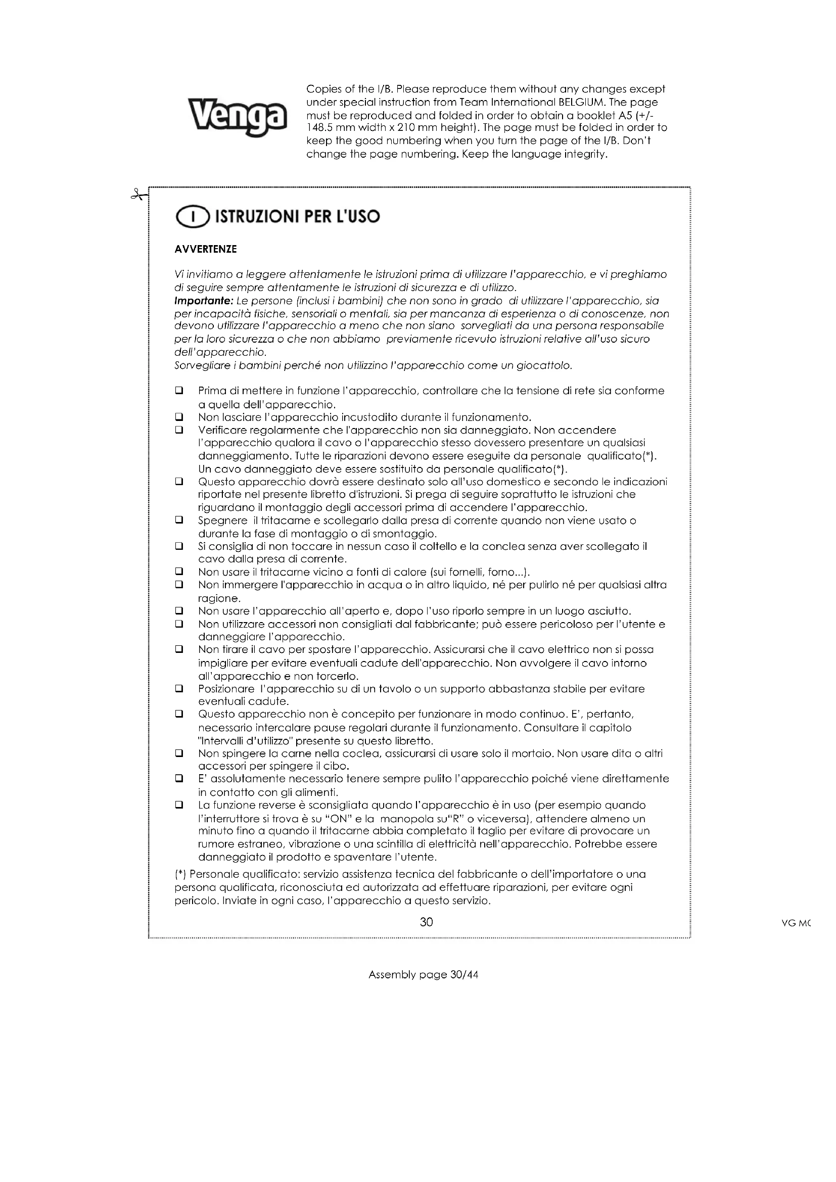 MANUALE UTENTE VG MGR 1 Venga