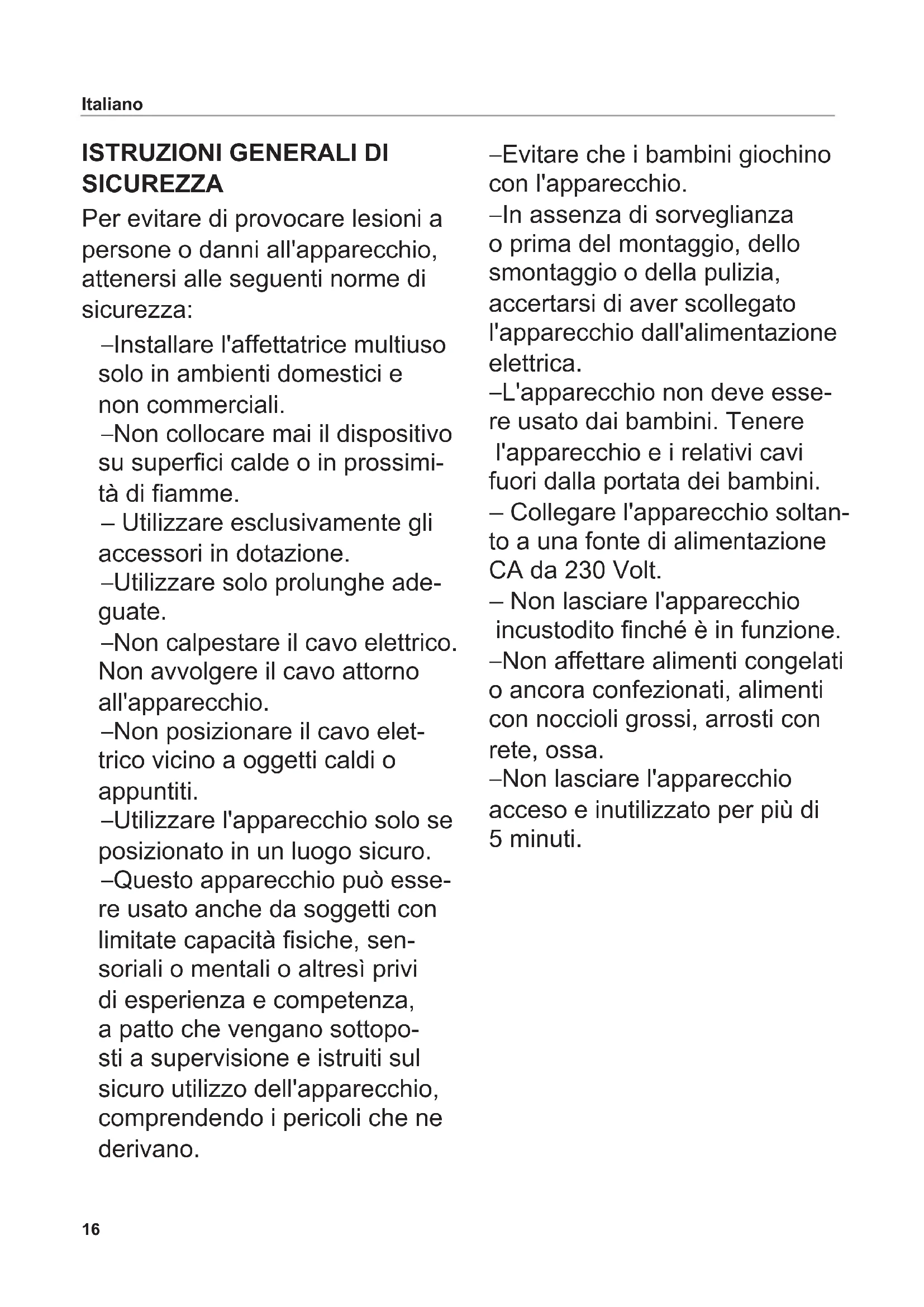 SICUREZZA Per evitare di provocare lesioni a persone o danni all'apparecchio, attenersi alle seguenti norme di sicurezza: – Installare l'affettatrice multiuso solo in ambienti domestici e non commerciali. – Non collocare mai il dispositivo su superci calde o in prossimi- tà di amme. – Utilizzare esclusivamente gli accessori in dotazione. – Utilizzare solo prolunghe ade- guate. – Non calpestare il cavo elettrico. Non avvolgere il cavo attorno all'apparecchio. – Non posizionare il cavo elet- trico vicino a oggetti caldi o appuntiti. – Utilizzare l'apparecchio solo se posizionato in un luogo sicuro. – Questo apparecchio può esse- re usato anche da soggetti con limitate capacità siche, sen- soriali o mentali o altresì privi di esperienza e competenza, a patto che vengano sottopo- sti a supervisione e istruiti sul sicuro utilizzo dell'apparecchio, comprendendo i pericoli che ne derivano. – Evitare che i bambini giochino con l'apparecchio. – In assenza di sorveglianza o prima del montaggio, dello smontaggio o della pulizia, accertarsi di aver scollegato l'apparecchio dall'alimentazione elettrica. – L'apparecchio non deve esse- re usato dai bambini. Tenere l'apparecchio e i relativi cavi fuori dalla portata dei bambini. – Collegare l'apparecchio soltan- to a una fonte di alimentazione CA da 230 Volt. – Non lasciare l'apparecchio incustodito nché è in funzione. – Non affettare alimenti congelati o ancora confezionati, alimenti con noccioli grossi, arrosti con rete, ossa. – Non lasciare l'apparecchio acceso e inutilizzato per più di 5 minuti.17 Italiano Rischio di folgorazione – Nel caso di malfunzionamento, prima di ogni intervento di puli- zia o quando l'apparecchio non viene utilizzato, disconnetterlo dalla presa di alimentazione. Eseguire questa operazione afferrando la presa, non il cavo. – Non immergere mai l'apparec- chio in acqua. Tenere l'appa- recchio lontano da qualsiasi fonte di umidità. Se l'apparecchio dovesse cadere accidentalmente in acqua, staccare immediata- mente la spina, quindi estrarlo dall'acqua. Prima di riutilizzare l'apparecchio, si consiglia di farlo controllare accuratamente in uno dei centri di assistenza autorizzati. – Non utilizzare l'apparecchio con le mani umide. Evitare di utilizzare l'apparecchio quan- do questo è umido o quando il pavimento è bagnato. Non uti- lizzare l'apparecchio all'aperto. – Interrompere immediatamente l'utilizzo se parti dell'apparec- chio risultano danneggiate. Inviare l'apparecchio completo al servizio assistenza clienti ritter. – Se il cavo elettrico viene dan- neggiato, per motivi di sicurez- za la sostituzione deve essere effettuata dal produttore, dal servizio di assistenza del pro- duttore o da personale altret- tanto qualicato. Pericolo di lesioni – Utilizzare sempre il carrel- lo o il pressasalumi, a meno che la forma o la grandezza dell'alimento da affettare non lo impediscano. – Spegnere l'apparecchio e scollegarlo dall'alimentazione elettrica prima di procedere alla sostituzione di accessori o componenti aggiuntivi che sono in movimento quando la mac- china è in funzione. – La lama è molto aflata. – Non toccare mai la lama men- tre l'apparecchio è in funzione. – Spegnere l'apparecchio prima di pulirlo, staccarlo dalla presa e portare la manopola di rego- lazione sulla posizione "0". – Dopo lo spegnimento, la lama continua a girare per alcuni secondi.18 Aprire le pagine dei graci nella copertina anteriore e posteriore del libretto. Leggere attentamente le istruzio- ni prima di mettere in funzione l'apparecchio. Conservare le istruzioni e, in caso di cessione dell'apparecchio, consegnarle al nuovo proprietario. UTILIZZO PREVISTO Questa affettatrice multiuso consente di affettare alimenti per uso domestico. L'utilizzo improprio o errato può causare gravi lesioni personali o danni all'apparecchio. In questi casi la garanzia perde la validità e l'azienda declina ogni forma di responsabilità.
