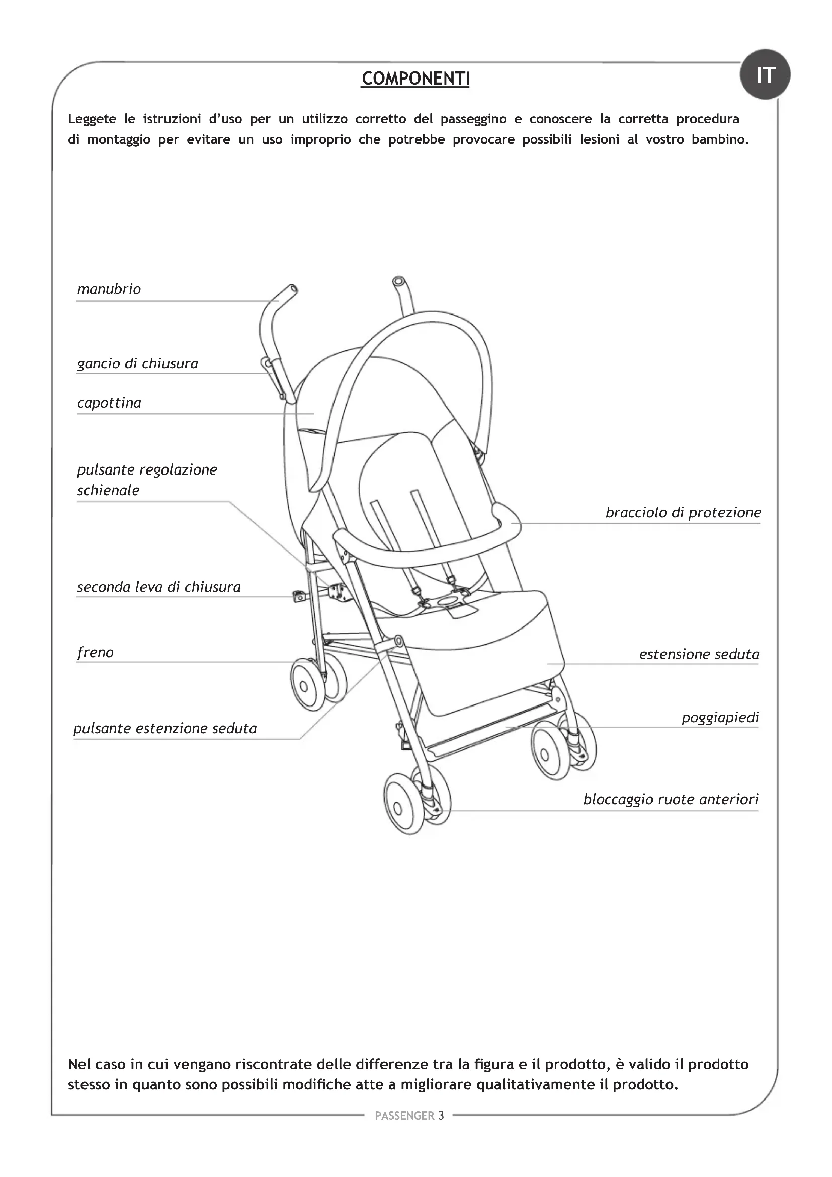 COMPONENTI pulsante regolazione schienale Leggete le istruzioni d’uso per un utilizzo corretto del passeggino e conoscere la corretta procedura di montaggio per evitare un uso improprio che potrebbe provocare possibili lesioni al vostro bambino. Nel caso in cui vengano riscontrate delle differenze tra la gura e il prodotto, è valido il prodotto stesso in quanto sono possibili modiche atte a migliorare qualitativamente il prodotto. manubrio capottina estensione seduta gancio di chiusura bloccaggio ruote anteriori poggiapiedi freno seconda leva di chiusura pulsante estenzione seduta