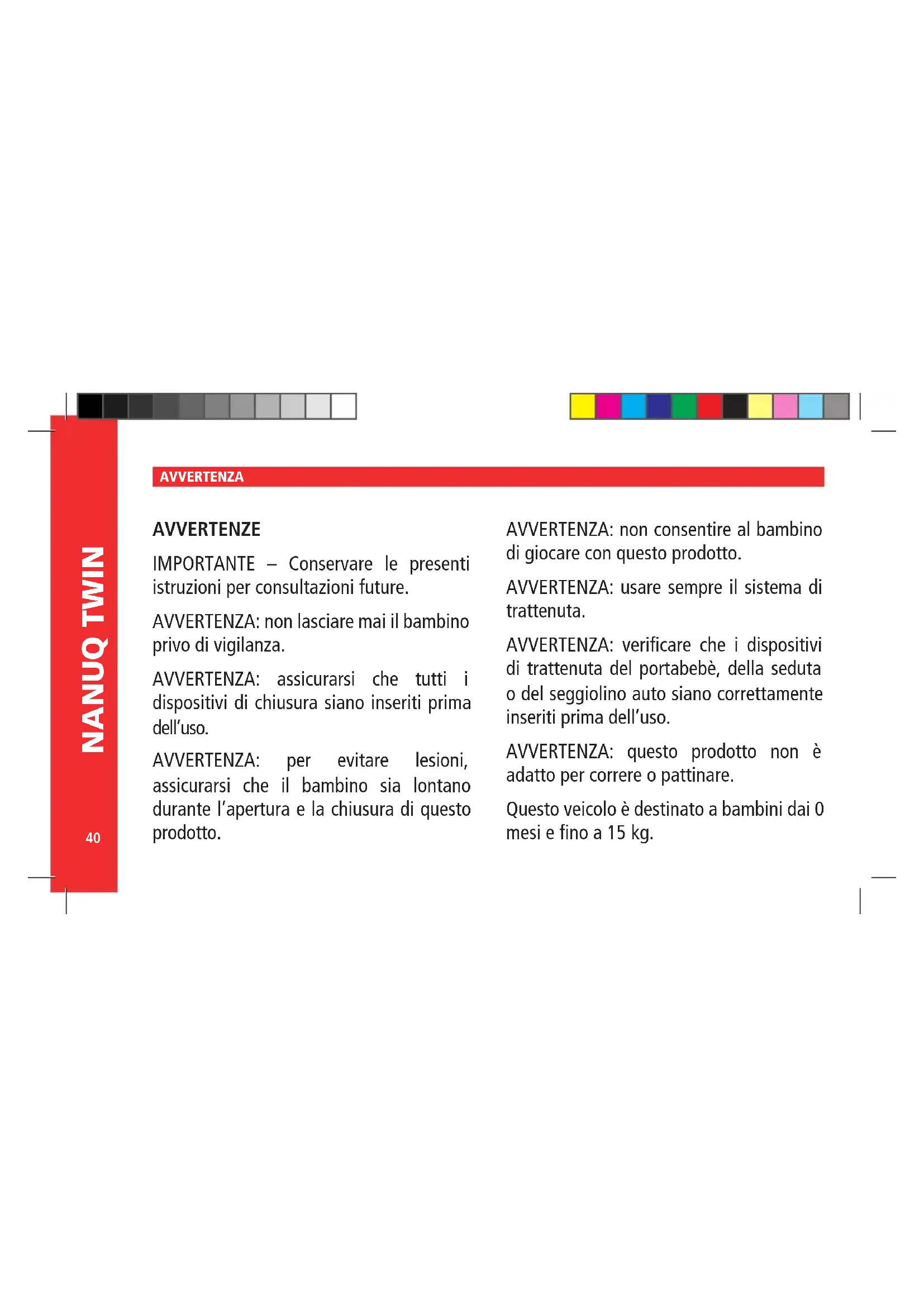 Aggiustate i due fermi inferiori e i velcri posteriori del para- pioggia. 12 12.- PARAPIOGGIA Non esporre il rivestimento ai raggi solari per intervalli lunghi. Lavare le parti di plastica con acqua insaponata, poi asciugare scrupolosamente tutti gli elementi. Il rivestimento può essere tolto e lavato. Controllare regolarmente i freni, le cinture e le chiusure che possano subire un deterioramento dovuto all’uso. È importante sottoporre il prodotto a una revisione periodi- ca in uno qualunque dei nostri centri ufficiali, sia per la sua sicurezza che per la buona conservazione del prodotto stesso. 13.- MANUTENZIONE Una volta inserita la capottina è possibile regolarne la po- sizione muovendo gli archetti secondo l’inclinazione dello schienale. Per toglierle seguire lo stesso procedimento in or- dine inverso. 10.5 AVVERTENZA: È imprescindibile assicurarsi che il bambino ven- ga tenuto lontano dal passeggino durante le azioni di chiusura e apertura. AVVERTENZA: L’apparizione di punti di taglio, compressione e in- trappolamento sono inevitabili durante queste operazioni.44 NANUQ TWIN