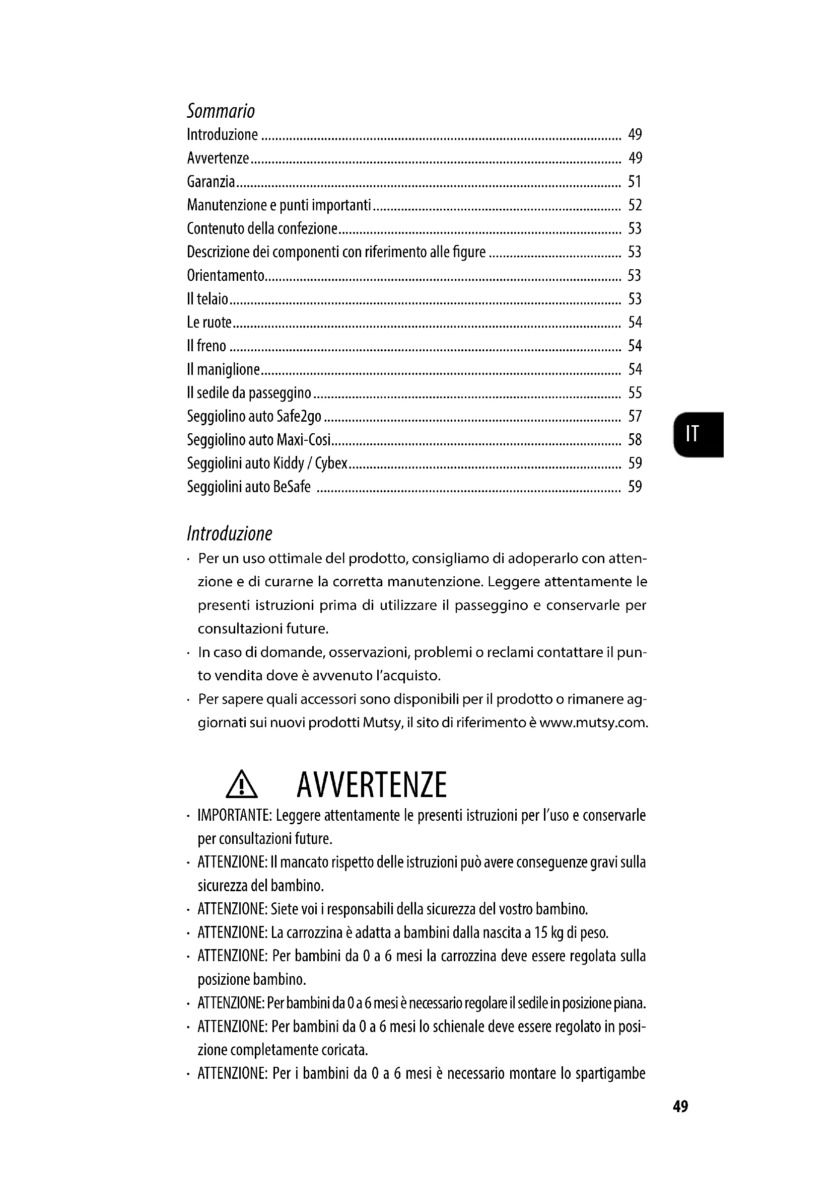- ATTENZIONE: Posizione sul prodotto borse e/o accessori diversi da quelli consigliati dal produttore, cui lo comporte l'instabilità del passeggino. Utilizzare esclusivamente accessori Mutsy originali.