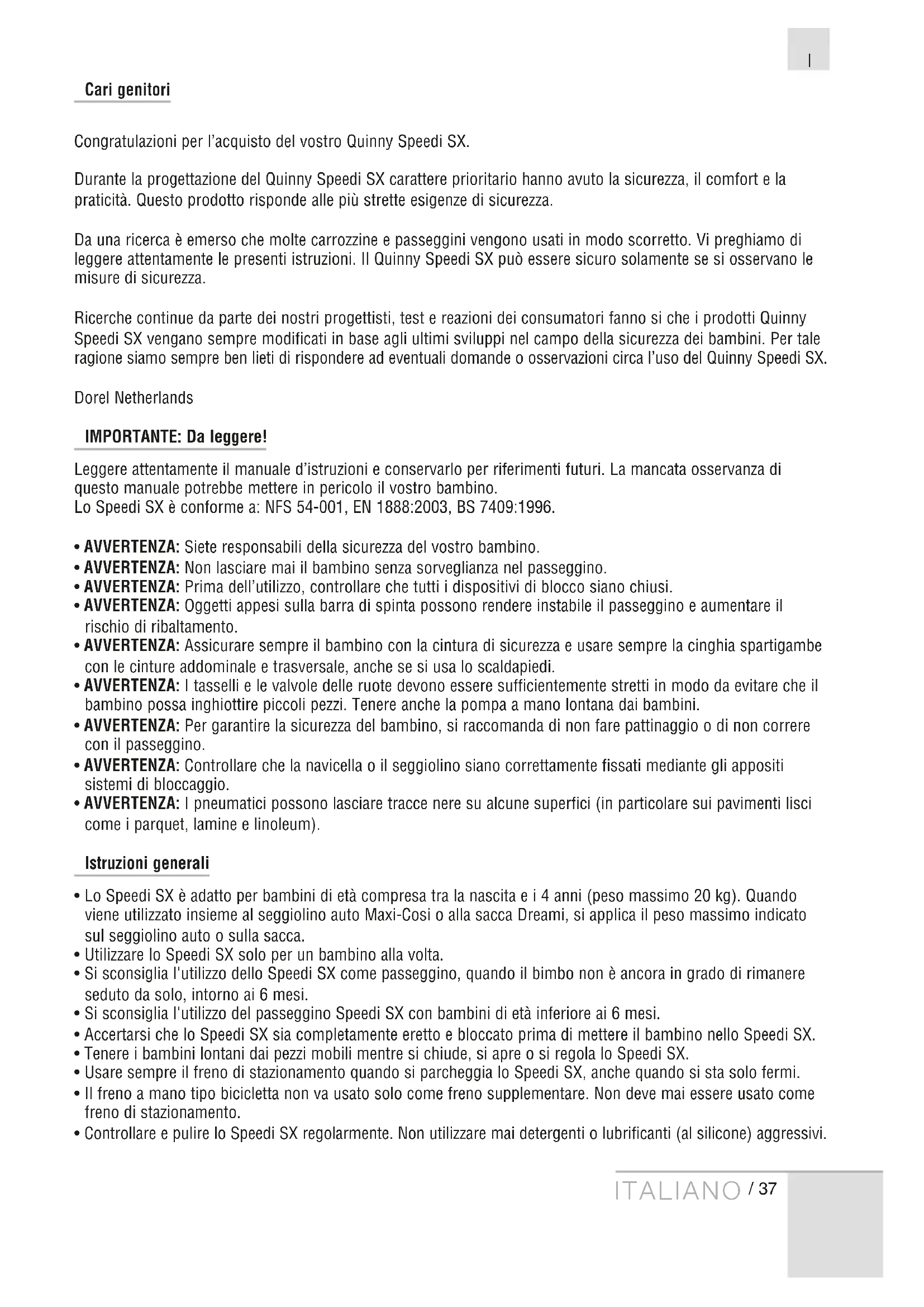 Cari genitori Congratulazioni per l’acquisto del vostro Quinny Speedi SX. Durante la progettazione del Quinny Speedi SX carattere prioritario hanno avuto la sicurezza, il comfort e la praticità. Questo prodotto risponde alle più strette esigenze di sicurezza. Da una ricerca è emerso che molte carrozzine e passeggini vengono usati in modo scorretto. Vi preghiamo di leggere attentamente le presenti istruzioni. Il Quinny Speedi SX può essere sicuro solamente se si osservano le misure di sicurezza. Ricerche continue da parte dei nostri progettisti, test e reazioni dei consumatori fanno si che i prodotti Quinny Speedi SX vengano sempre modificati in base agli ultimi sviluppi nel campo della sicurezza dei bambini. Per tale ragione siamo sempre ben lieti di rispondere ad eventuali domande o osservazioni circa l’uso del Quinny Speedi SX. Dorel Netherlands IMPORTANTE: Da leggere! Leggere attentamente il manuale d’istruzioni e conservarlo per riferimenti futuri. La mancata osservanza di questo manuale potrebbe mettere in pericolo il vostro bambino. Lo Speedi SX è conforme a: NFS 54-001, EN 1888:2003, BS 7409:1996.