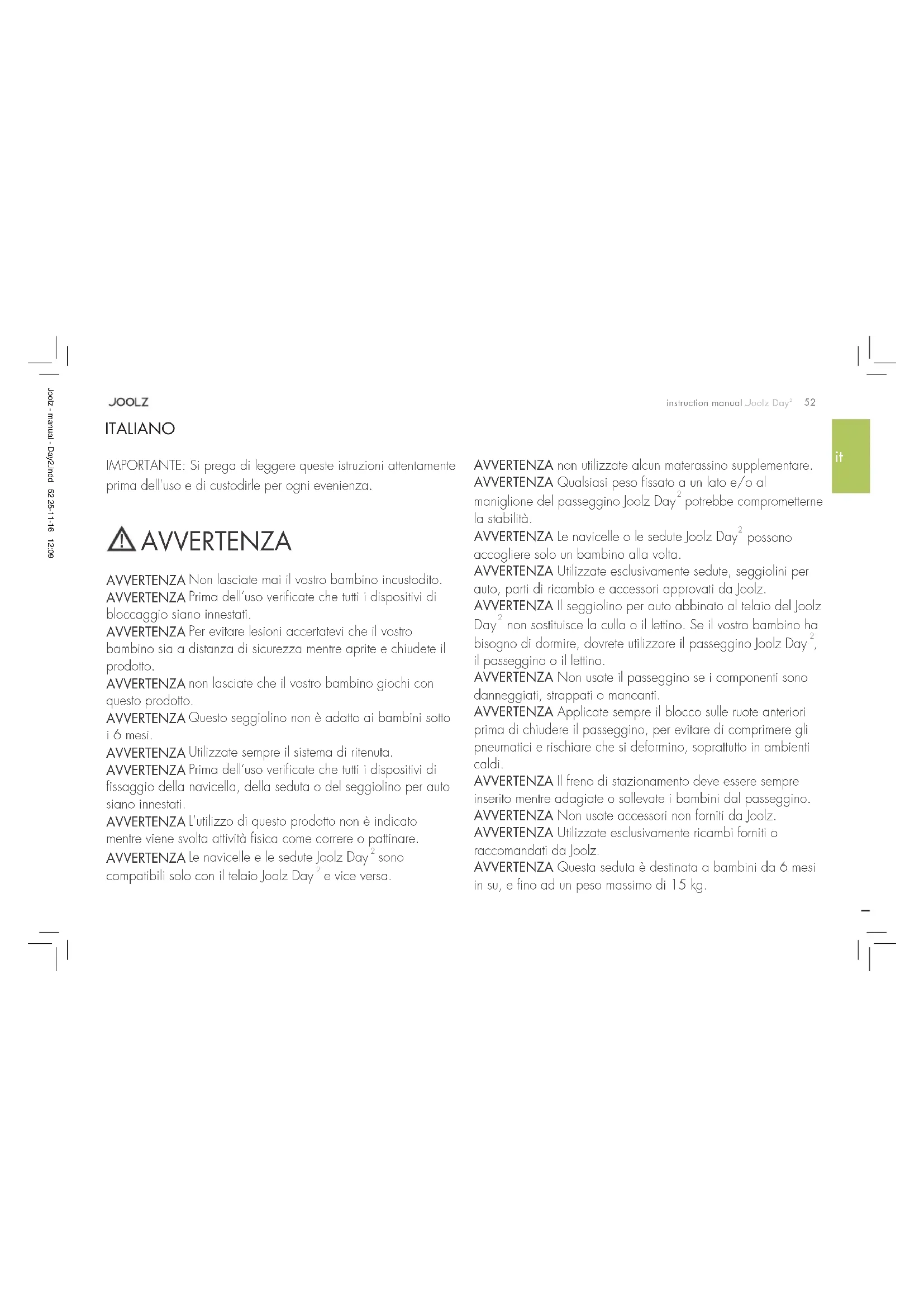 IMPORTANTE: Si prega di leggere queste istruzioni attentamente prima dell'uso e di custodirle per ogni evenienza. AVVERTENZA AVVERTENZA Non lasciate mai il vostro bambino incustodito. AVVERTENZA Prima dell’uso verificate che tutti i dispositivi di bloccaggio siano innestati. AVVERTENZA Per evitare lesioni accertatevi che il vostro bambino sia a distanza di sicurezza mentre aprite e chiudete il prodotto. AVVERTENZA non lasciate che il vostro bambino giochi con questo prodotto. AVVERTENZA Questo seggiolino non è adatto ai bambini sotto i 6 mesi. AVVERTENZA Utilizzate sempre il sistema di ritenuta. AVVERTENZA Prima dell’uso verificate che tutti i dispositivi di fissaggio della navicella, della seduta o del seggiolino per auto siano innestati. AVVERTENZA L’utilizzo di questo prodotto non è indicato mentre viene svolta attività fisica come correre o pattinare. AVVERTENZA Le navicelle e le sedute Joolz Day