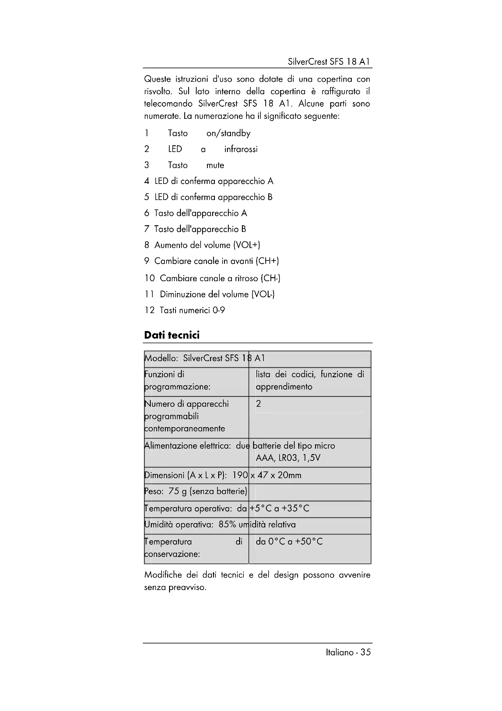 Italiano - 35 Queste istruzioni d'uso sono dotate di una copertina con risvolto. Sul lato interno della copertina è raffigurato il telecomando SilverCrest SFS 18 A1. Alcune parti sono numerate. La numerazione ha il significato seguente: 1 Tasto on/standby 2 LED a infrarossi 3 Tasto mute 4 LED di conferma apparecchio A 5 LED di conferma apparecchio B 6 Tasto dell'apparecchio A 7 Tasto dell'apparecchio B 8 Aumento del volume (VOL+) 9 Cambiare canale in avanti (CH+) 10 Cambiare canale a ritroso (CH-) 11 Diminuzione del volume (VOL-) 12 Tasti numerici 0-9 Dati tecnici Modello: SilverCrest SFS 18 A1 Funzioni di programmazione: lista dei codici, funzione di apprendimento Numero di apparecchi programmabili contemporaneamente