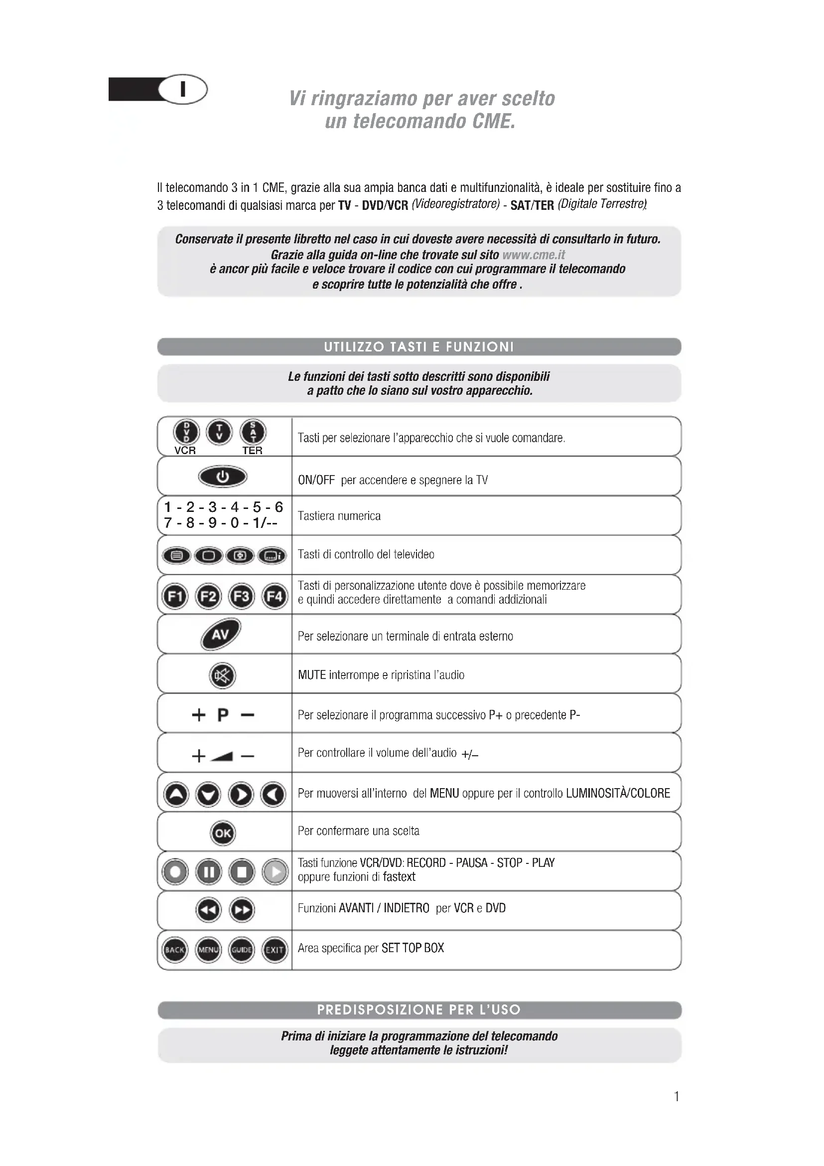 Le funzioni dei tasti sotto descritti sono disponibili a patto che lo siano sul vostro apparecchio. Conservate il presente libretto nel caso in cui doveste avere necessità di consultarlo in futuro. Grazie alla guida on-line che trovate sul sito www.cme.it è ancor più facile e veloce trovare il codice con cui programmare il telecomando e scoprire tutte le potenzialità che offre . Il telecomando 3 in 1 CME, grazie alla sua ampia banca dati e multifunzionalità, è ideale per sostituire fino a 3 telecomandi di qualsiasi marca per TV - DVD/VCR (Videoregistratore) - SAT/TER (Digitale Terrestre)