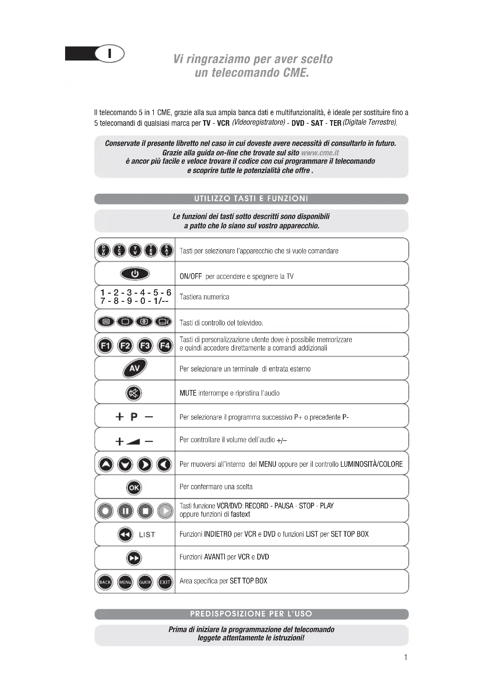 Le funzioni dei tasti sotto descritti sono disponibili a patto che lo siano sul vostro apparecchio. Conservate il presente libretto nel caso in cui doveste avere necessità di consultarlo in futuro. Grazie alla guida on-line che trovate sul sito www.cme.it è ancor più facile e veloce trovare il codice con cui programmare il telecomando e scoprire tutte le potenzialità che offre . Il telecomando 5 in 1 CME, grazie alla sua ampia banca dati e multifunzionalità, è ideale per sostituire fino a5 telecomandi di qualsiasi marca per TV - VCR (Videoregistratore)