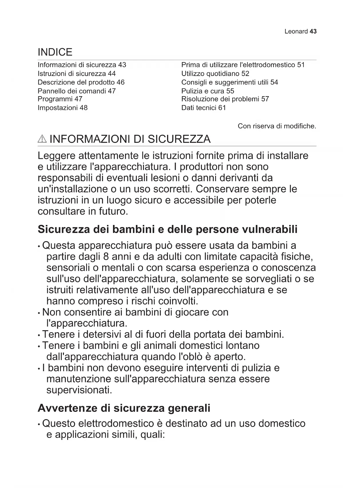 Rispettare il numero massimo di 13 coperti. - Se il cavo di alimentazione è danneggiato, deve essere sostituito dal produttore, dal Centro di Assistenza Autorizzato o da una persona qualificata per evitare situazioni di pericolo.