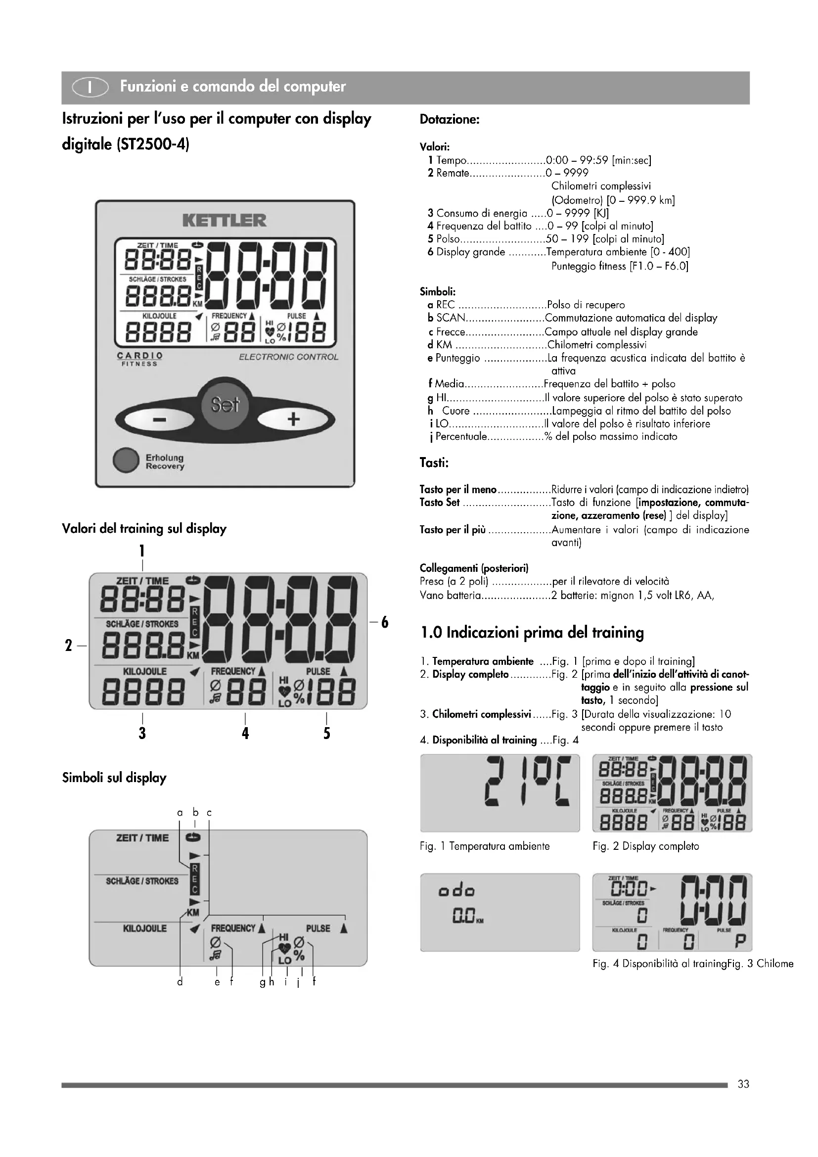damente degli adeguamenti dei legamenti, dei tendini e delle articola- zioni. Risultato: durante il processo progressivo del training la resistenza deve essere aumentata lentamente. Rappresentazione breve della programmazione dei training *Serie *Rip. = numero delle ripetizioni Incominciate il training facendo sempre degli esercizi di riscaldamento. Durante l’allenamento fate una pausa di circa 60 secondi in seguito ad una serie di esercizi e approfittatene per effettuare degli esercizi di rilassamento e distensione. Allenatevi per ca. 2-3 volte alla settimana con il vostro COACH LS e appro- fittate di ogni occasione per completare il training, come per es. facendo delle lunghe passeggiate, bicicletta, nuoto, etc. Noterete che praticando un training regolare, il vostro benessere fisico migliorerà in breve tempo. Avvertimenti! Vi state allenando con un apparecchio costruito secondo le più nuove cognizioni tecniche. Possibili punti di pericolo, i quali potrebbero causare ferimenti, sono stati evitati nel miglior modo possibile. L’apparecchio è stato esclusivamente concepito per l’impiego da parte di persone adulte. Un training esagerato oppure errato può provocare danni alla salute. Prima di intraprendere l’attività di training, consultate il vostro medico al fine di stabilire se il fisico si presta all’allenamento con questo apparecchio. Il reperto medico dovrebbe essere alla base per il vostro programma di training. L’apparecchio non è un giocattolo. Considerate il fatto, che per via del desiderio naturale di giocare da parte dei bambini, potrebbero suben- trare delle situazioni e dei pericoli imprevedibili, che esonerano il produttore da qualsiasi responsabilità. Se i bambini maneggiano comunque l’appa- recchio, essi dovranno essere istruiti sul corretto uso ed essere sorvegliati. IL montaggio dell’apparecchio deve essere eseguito accuratamente da una persona adulta. Assicuratevi che prima di iniziare l’attività di training, l’apparecchio sia montato a regola d’arte. Esercizio 1ª-2ª la settimana 3ª-4ª la settimana 5ª-6ª la settimana S* rip.* S* rip.* S* rip.* 1 1 -2 individ. 2 individ. 3 individ. 4 1 -2 12-15 2 15-20 3 15-20 7 1 -2 12-15 2 15-20 3 15-20 9 1 -2 12-15 2 15-20 3 15-20 13 1 -2 12-15 2 15-20 3 15-20 14 1 -2 12-15 2 15-20 3 15-20 17 1 -2 12-15 2 15-20 3 15-2039 Instrukcja obsugi komputera treningowego ze wskanikiem cyfrowym (ST2500-4) Wyposażenie: Wartości: 1 czas ......................................0:00 - 99:59 [min:sek] 2 uderzenia wiosłami...............0 - 9999 całkowita liczba kilometrów [0 - 999.9 km] 3 zużycie energii......................0 - 9999 [KJ] 4 tempo wiosłowania ..............0 - 99 [ilość ruchów/min] 5 puls.......................................50 - 199 [uderzenia/min] 6 duży wskaźnik ......................temperatura pomieszczenia [0 - 40 ˚] ocena sprawności [F1.0 - F6.0] Symbole: a REC ......................................tętno w fazie odpoczynku b SCAN....................................automatyczna zmiana wskaźników c strzałka .................................aktualny obszar na dużym wskaźniku d KM........................................całkowita liczba kilometrów e ocena....................................akustyczne ustawienie częstotliwości uderzeń f przeciętna wartość...............częstotliwość uderzeń + tętno g HI..........................................powyżej górnej wartości tętna h serce.....................................miga w rytm uderzeń tętna i LO.........................................poniżej dolnej wartości tętna j Procent.................................% od max ustawienia tętna Klawisze: Klawisz minus ..............................zmniejszanie wartości Klawisz SET .................................klawisz funkcyjny [ustawienie, zmiana, resetowanie wskazania] Klawisz Plus .................................zwiększanie wartości Klawisz Recovery.........................klawisz funkcyjny (przyznawanie ocen sprawności) Przyłącza (z tyłu) Gniazdko (2-biegunowe)..............do pomiaru prędkości Baterie..........................................2 baterie: Mignon 1,5 Volt, LR6, AA,