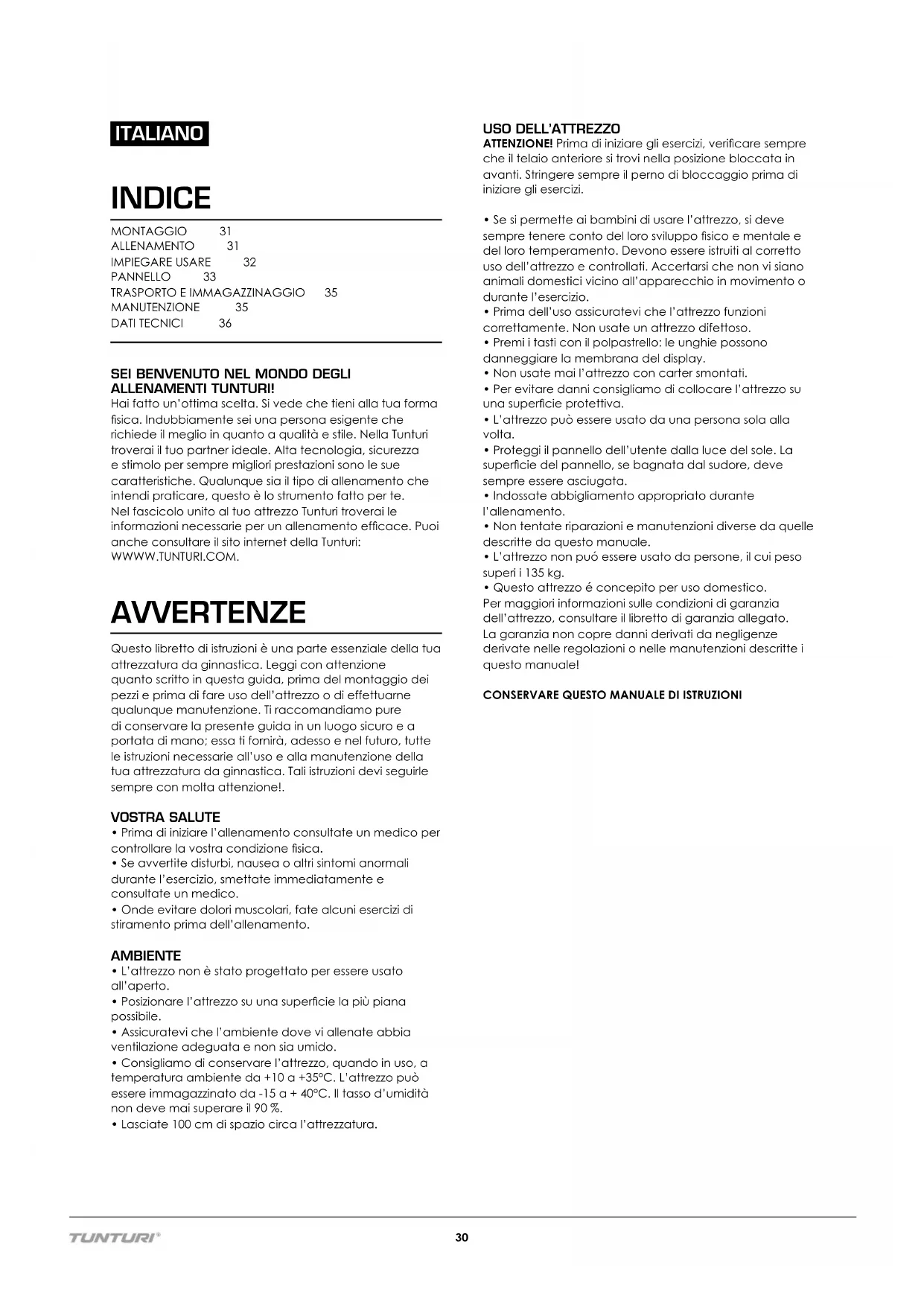 ALLENAMENTI TUNTURI! Hai fatto un’ottima scelta. Si vede che tieni alla tua forma sica. Indubbiamente sei una persona esigente che richiede il meglio in quanto a qualità e stile. Nella Tunturi troverai il tuo partner ideale. Alta tecnologia, sicurezza e stimolo per sempre migliori prestazioni sono le sue caratteristiche. Qualunque sia il tipo di allenamento che intendi praticare, questo è lo strumento fatto per te. Nel fascicolo unito al tuo attrezzo Tunturi troverai le informazioni necessarie per un allenamento efcace. Puoi anche consultare il sito internet della Tunturi: WWWW.TUNTURI.COM. AVVERTENZE Questo libretto di istruzioni è una parte essenziale della tua attrezzatura da ginnastica. Leggi con attenzione quanto scritto in questa guida, prima del montaggio dei pezzi e prima di fare uso dell’attrezzo o di effettuarne qualunque manutenzione. Ti raccomandiamo pure di conservare la presente guida in un luogo sicuro e a portata di mano; essa ti fornirà, adesso e nel futuro, tutte le istruzioni necessarie all’uso e alla manutenzione della tua attrezzatura da ginnastica. Tali istruzioni devi seguirle sempre con molta attenzione!. VOSTRA SALUTE