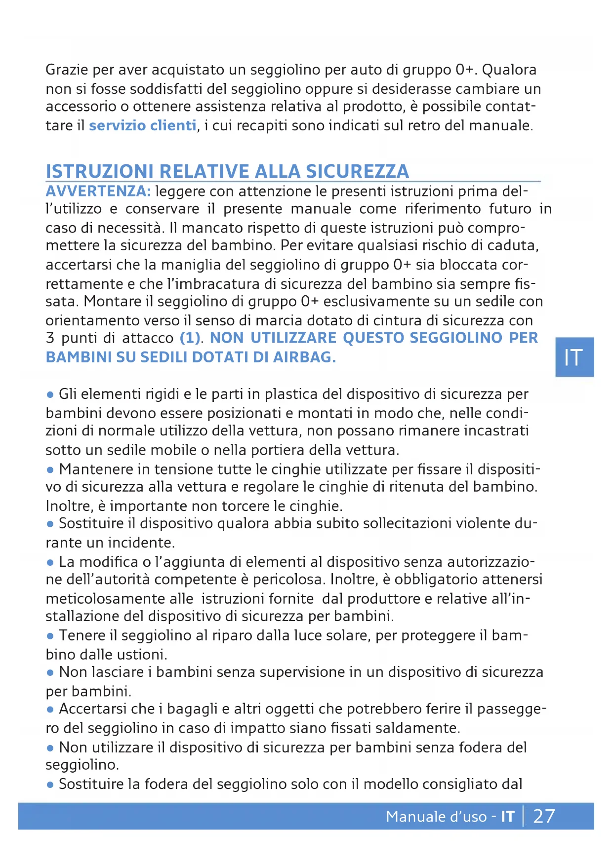 - Als u twiffelt, neemt u contact op met de fabrikant van het kinderzitje of vraag uw verkoper. NL27 Manuale d’uso - IT Grazie per aver acquistato un seggiolino per auto di gruppo 0+. Qualora non si fosse soddisfatti del seggiolino oppure si desiderasse cambiare un accessorio o ottenere assistenza relativa al prodotto, è possibile contat- tare il servizio clienti, i cui recapiti sono indicati sul retro del manuale.