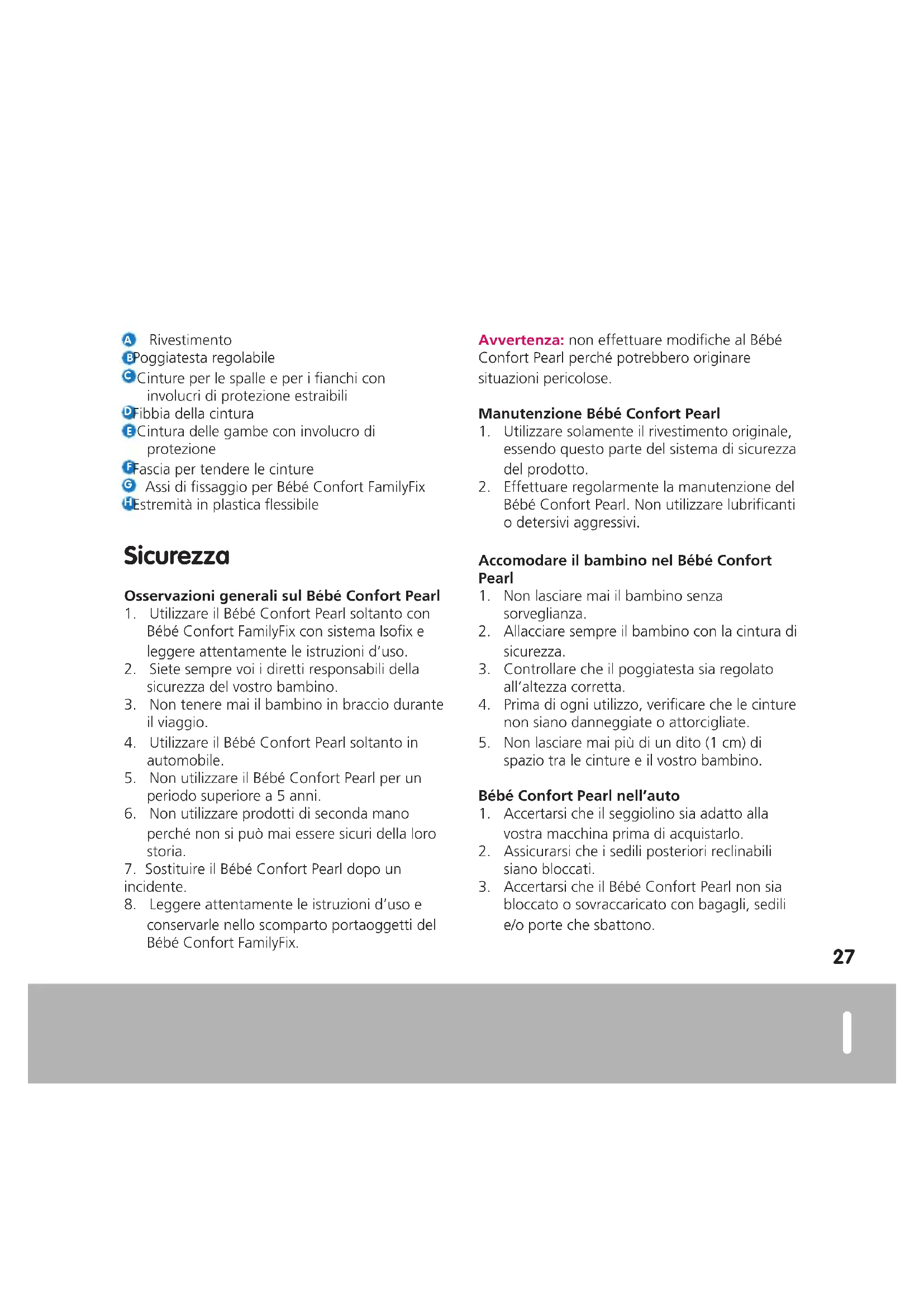 DRU0772 PEARL BBC LIVRET.indd 26 3/14/14 2:29 PM27 Rivestimento Poggiatesta regolabile Cinture per le spalle e per i fianchi con involucri di protezione estraibili Fibbia della cintura Cintura delle gambe con involucro di protezione Fascia per tendere le cinture Assi di fissaggio per Bébé Confort FamilyFix Estremità in plastica flessibile Sicurezza Osservazioni generali sul Bébé Confort Pearl