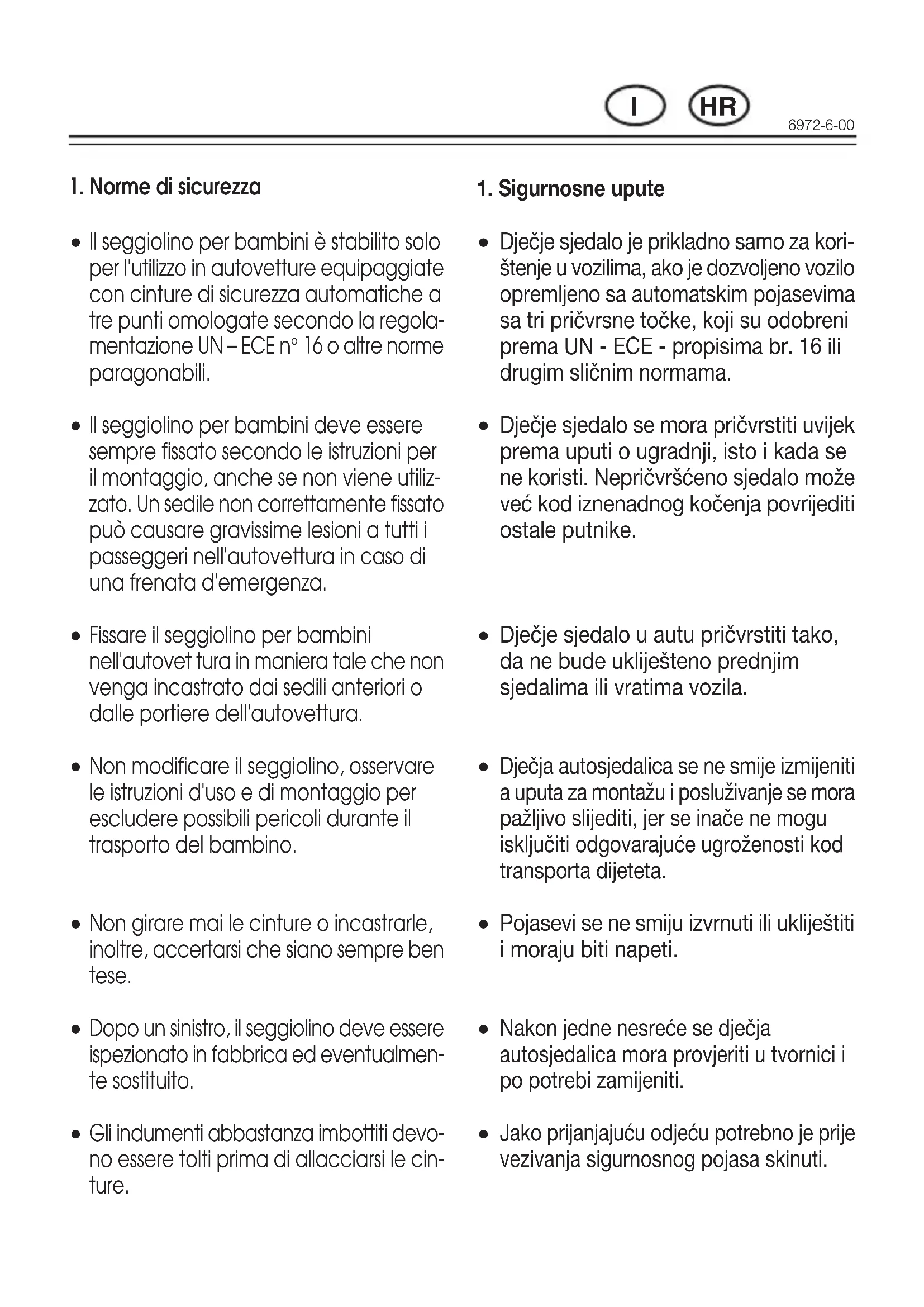 - Il seggiolino per bambini è stabilito solo per l'utilizzo in autovetture equipaggiate con cinture di sicurezza automatiche a tre punti omologate secondo la regolamentiazione UN - ECE n° 16 o altre norme paragonabili.