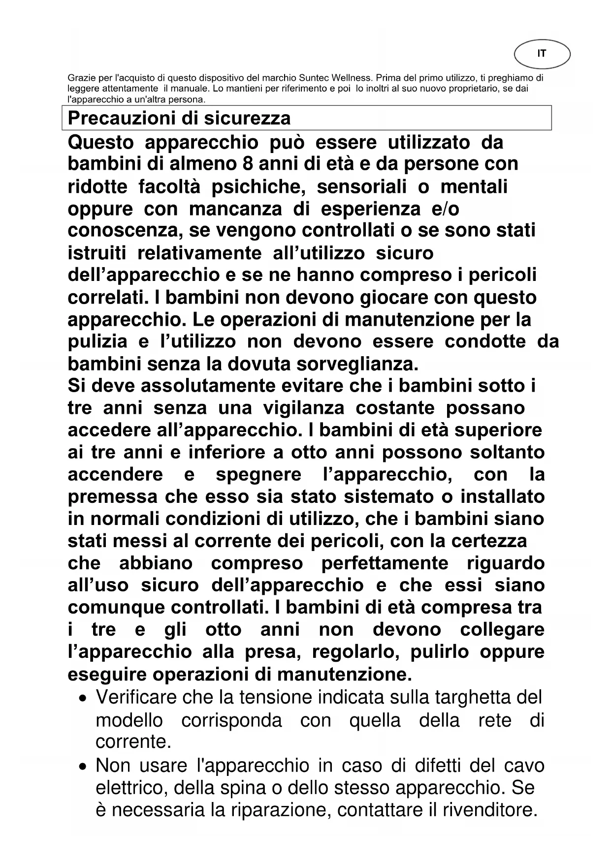 Heat Block PTC SUNTEC WELLNESS GMBH / HOLZSTRASSE 2 / 40221 DÜSSELDORF / GERMANYGrazie per l'acquisto di questo dispositivo del marchio Suntec Wellness. Prima del primo utilizzo, ti preghiamo di leggere attentamente il manuale. Lo mantieni per riferimento e poi lo inoltri al suo nuovo proprietario, se dai l'apparecchio a un'altra persona. Precauzioni di sicurezza Questo apparecchio può essere utilizzato da bambini di almeno 8 anni di età e da persone con ridotte facoltà psichiche, sensoriali o mentali oppure con mancanza di esperienza e/o conoscenza, se vengono controllati o se sono stati istruiti relativamente all’utilizzo sicuro dell’apparecchio e se ne hanno compreso i pericoli correlati. I bambini non devono giocare con questo apparecchio. Le operazioni di manutenzione per la pulizia e l’utilizzo non devono essere condotte da bambini senza la dovuta sorveglianza. Si deve assolutamente evitare che i bambini sotto i tre anni senza una vigilanza costante possano accedere all’apparecchio. I bambini di età superiore ai tre anni e inferiore a otto anni possono soltanto accendere e spegnere l’apparecchio, con la premessa che esso sia stato sistemato o installato in normali condizioni di utilizzo, che i bambini siano stati messi al corrente dei pericoli, con la certezza che abbiano compreso perfettamente riguardo all’uso sicuro dell’apparecchio e che essi siano comunque controllati. I bambini di età compresa tra i tre e gli otto anni non devono collegare l’apparecchio alla presa, regolarlo, pulirlo oppure eseguire operazioni di manutenzione.