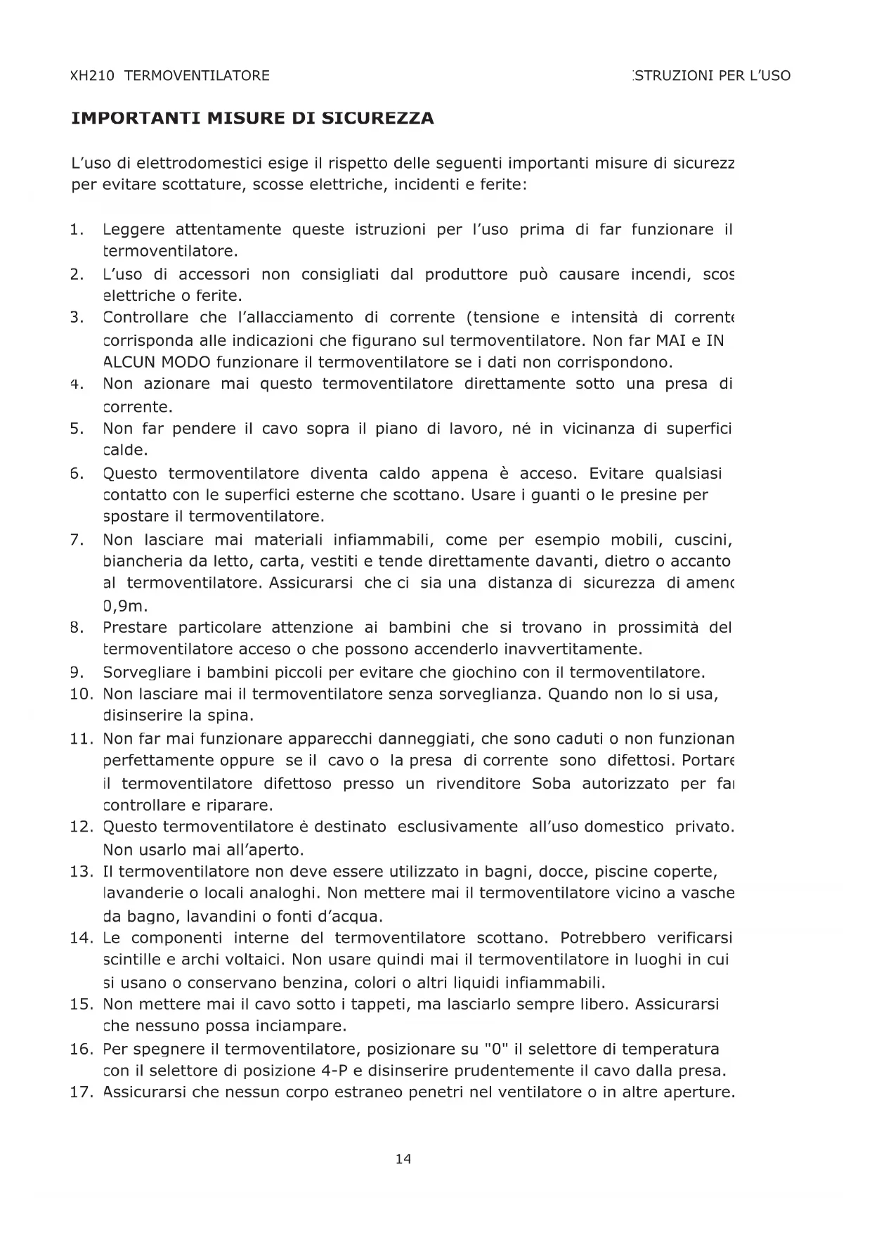 Assicurarsi che nessun corpo estraneo penetri nel ventilatore o in altre aperture. XH210 TERMOVENTILATORE