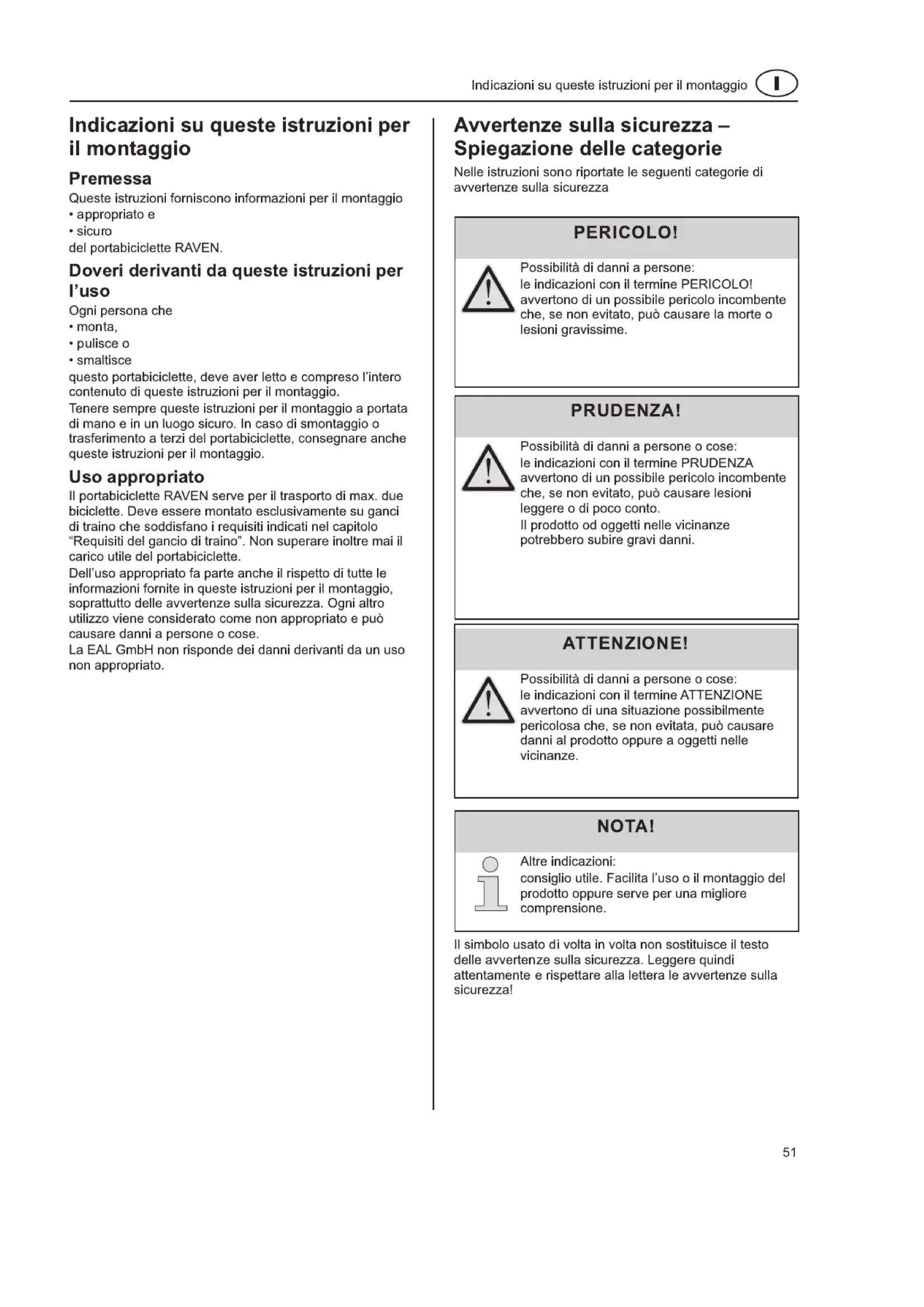 - smaltisce questo portabiciclette, deve aver letto e compreso l’intero contenuto di queste istruzioni per il montaggio. Tenere sempre queste istruzioni per il montaggio a portata di mano e in un luogo sicuro. In caso di smontaggio o trasferimento a terzi del portabiciclette, consegnare anche queste istruzioni per il montaggio. Uso appropriato Il portabiciclette RAVEN serve per il trasporto di max. due biciclette. Deve essere montato esclusivamente su ganci di traino che soddisfano i requisiti indicati nel capitolo “Requisiti del gancio di traino”. Non superare inoltre mai il carico utile del portabiciclette. Dell’uso appropriato fa parte anche il rispetto di tutte le informazioni fornite in queste istruzioni per il montaggio, soprattutto delle avvertenze sulla sicurezza. Ogni altro utilizzo viene considerato come non appropriato e può causare danni a persone o cose. La EAL GmbH non risponde dei danni derivanti da un uso non appropriato.52 PERICOLO! Danni a persone o cose derivanti dalla perdita delle biciclette. Viaggiare senza cinghie di sicurezza può causare incidenti.