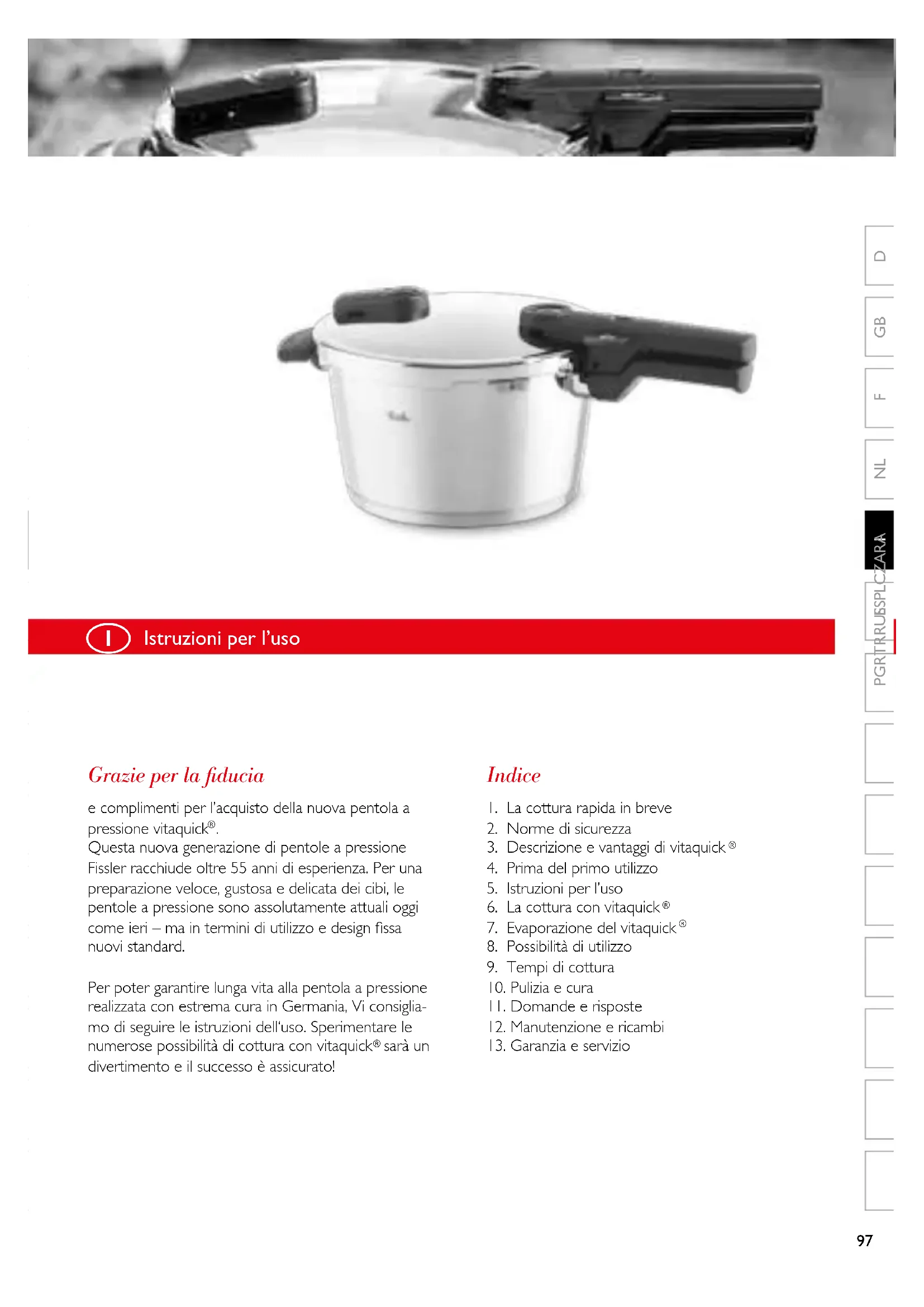 Per poter garantire lunga vita alla pentola a pressione realizzata con estrema cura in Germania, Vi consiglio-mo di seguire le istruzioni dell'uso. Sperimentare le numerouse possibilità di cottura con vitaquick® sare un divertimento e il successo è assicurato!