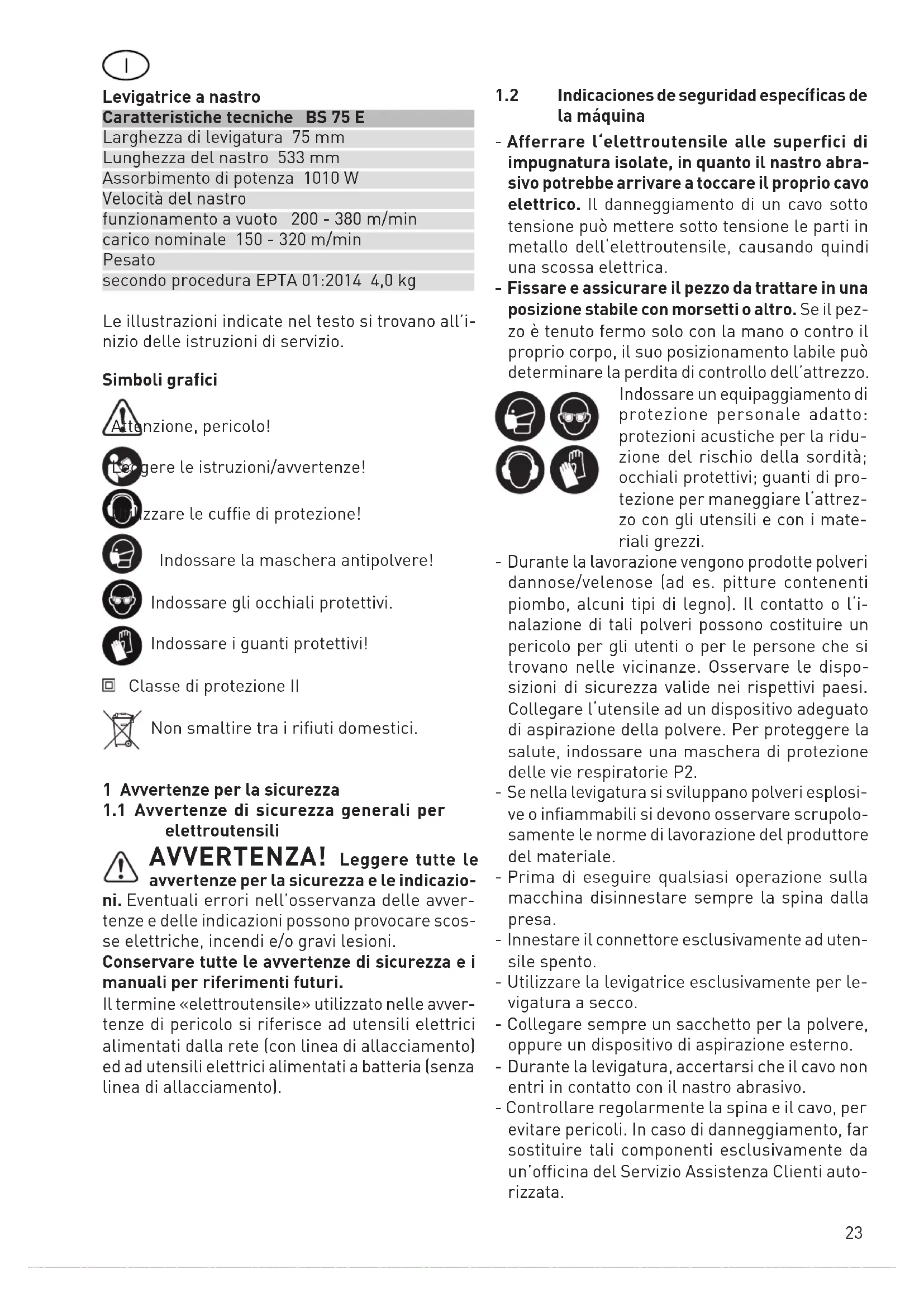 Indicaciones de seguridad especícas de la máquina - Afferrare l‘elettroutensile alle superfici di impugnatura isolate, in quanto il nastro abra‑ sivo potrebbe arrivare a toccare il proprio cavo elettrico. Il danneggiamento di un cavo sotto tensione può mettere sotto tensione le parti in metallo dell‘elettroutensile, causando quindi una scossa elettrica. ‑ Fissare e assicurare il pezzo da trattare in una posizione stabile con morsetti o altro. Se il pez- zo è tenuto fermo solo con la mano o contro il proprio corpo, il suo posizionamento labile può determinare la perdita di controllo dell’attrezzo. Indossare un equipaggiamento di protezione personale adatto: protezioni acustiche per la ridu- zione del rischio della sordità; occhiali protettivi; guanti di pro- tezione per maneggiare l‘attrez- zo con gli utensili e con i mate- riali grezzi. - Durante la lavorazione vengono prodotte polveri dannose/velenose (ad es. pitture contenenti piombo, alcuni tipi di legno). Il contatto o l‘i- nalazione di tali polveri possono costituire un pericolo per gli utenti o per le persone che si trovano nelle vicinanze. Osservare le dispo- sizioni di sicurezza valide nei rispettivi paesi. Collegare l‘utensile ad un dispositivo adeguato di aspirazione della polvere. Per proteggere la salute, indossare una maschera di protezione delle vie respiratorie P2. - Se nella levigatura si sviluppano polveri esplosi- ve o infiammabili si devono osservare scrupolo- samente le norme di lavorazione del produttore del materiale. - Prima di eseguire qualsiasi operazione sulla macchina disinnestare sempre la spina dalla presa. - Innestare il connettore esclusivamente ad uten- sile spento. - Utilizzare la levigatrice esclusivamente per le- vigatura a secco. - Collegare sempre un sacchetto per la polvere, oppure un dispositivo di aspirazione esterno. - Durante la levigatura, accertarsi che il cavo non entri in contatto con il nastro abrasivo. - Controllare regolarmente la spina e il cavo, per evitare pericoli. In caso di danneggiamento, far sostituire tali componenti esclusivamente da un’officina del Servizio Assistenza Clienti auto- rizzata.24 - Non utilizzare nastri abrasivi usurati, strappati o che abbiano subito forti sollecitazioni.