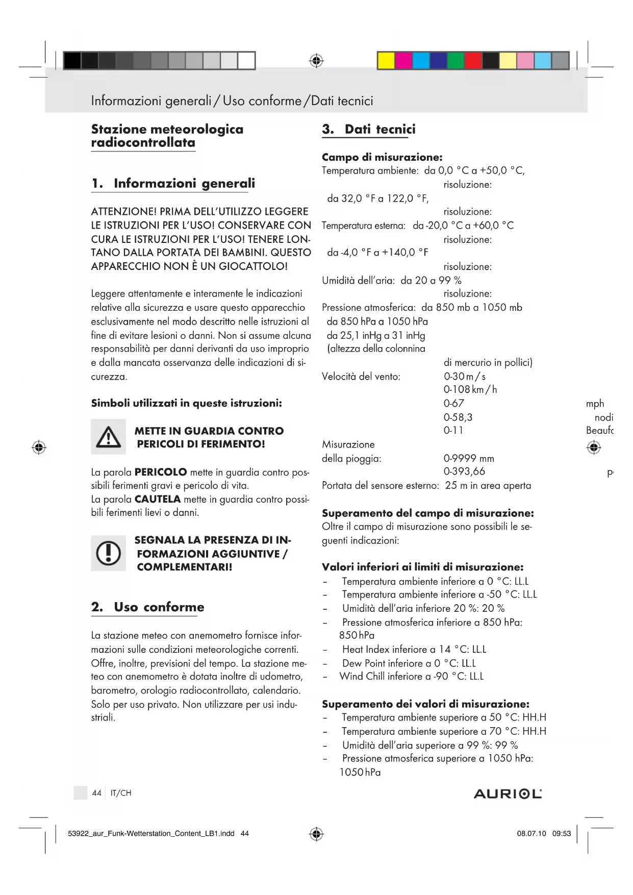alla sicurezza PERICOLO PER I BAMBINI! L’ingestione delle batterie può essere mortale. Batterie e stazione meteo devono essere conser- vate fuori della portata dei bambini. In caso di ingestione delle batterie deve essere immediata- mente consultato un medico. PERICOLO DI FERIMENTO! Rimuovere la batteria esaurita dall’apparecchio. Non mettere in cortocircuito i poli di attacco. Questo apparecchio non è concepito per essere usato da persone (compresi bambini) con capa- cità fisiche, sensoriali o mentali limitate o da persone di scarsa esperienza e / o conoscenza senza la sorveglianza di una persona competente o senza prima aver ricevuto indicazioni sul modo di usare l’apparecchio. CAUTELA - DANNI ALLE COSE! Utilizzare solo il tipo di batterie indicato. Fare attenzione alla polarità della batteria. Controllare regolarmente che non ci siano perdite nelle batterie. In caso di inutilizzo prolungato dell’apparecchio, togliere le batterie. Non immergere mai la stazione meteo ed il sensore esterno in acqua o altri liquidi. Osservare le indicazioni per la pulizia e per la conservazione di queste istruzioni. 53922_aur_Funk-Wetterstation_Content_LB1.indd 45 08.07.10 09:5346 IT/CH Dotazione / Definizioni